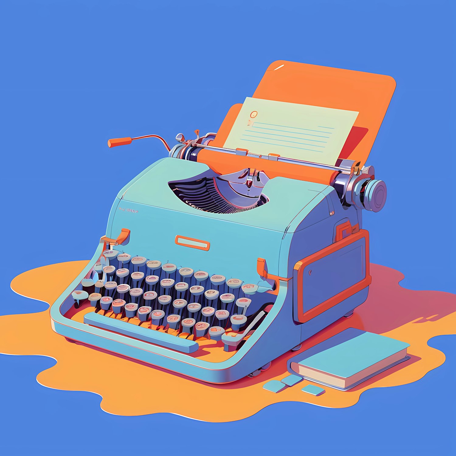 Colorful illustration of a retro typewriter in turquoise and orange, with a surreal melting effect and matching notepads.