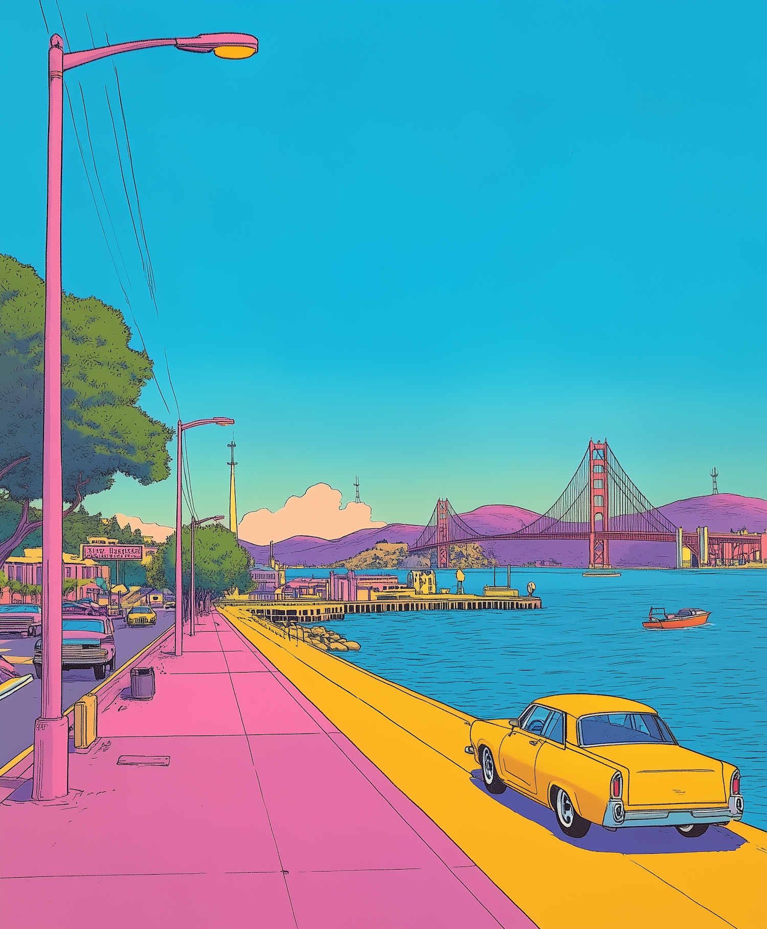 Colorful retro cityscape with a vintage car, pink sidewalk, and iconic bridge under a bright blue sky.