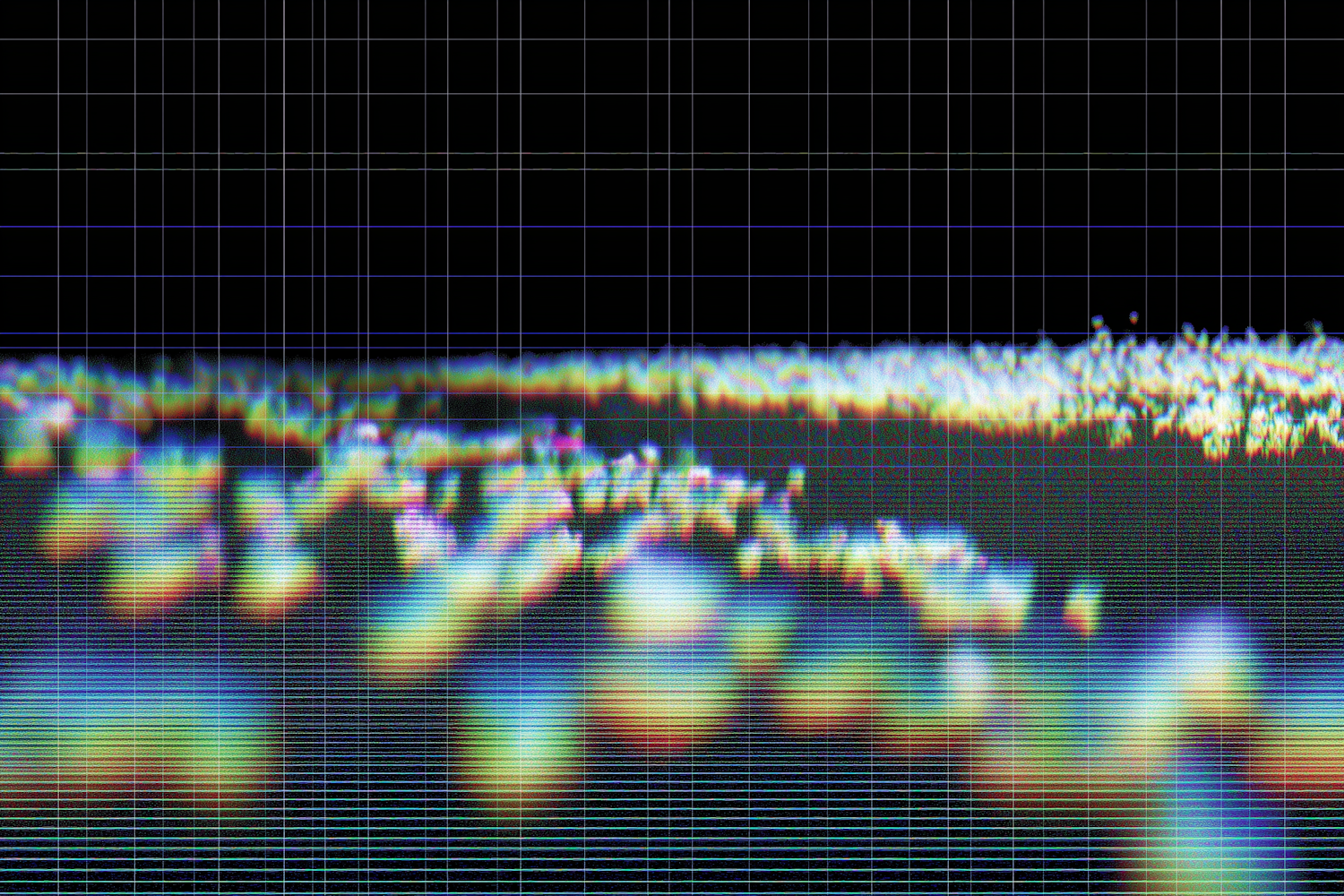 Abstract digital visualization with colorful waveforms on a black background, overlaid with a grid pattern for a modern, tech-inspired look.
