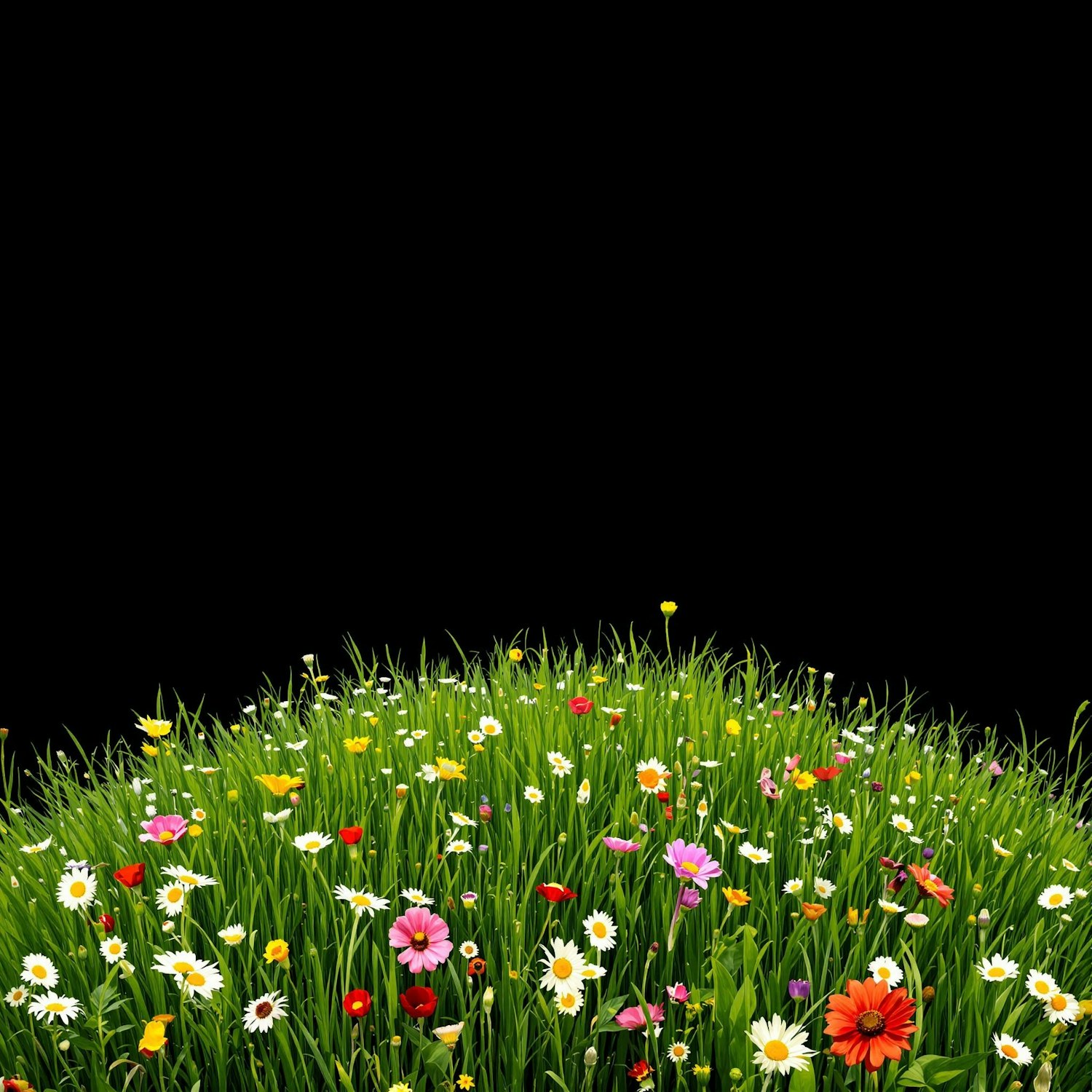 A solid black background with a lush green grass field at the bottom, shaped in a soft concave arc that curves slightly upward from the sides toward the center. The grass is filled with flowers of many types, sizes, and colors—daisies, poppies, cosmos, and more—growing naturally with variation in height and density. The entire field stays anchored at the bottom of the frame, leaving the upper space fully black.
