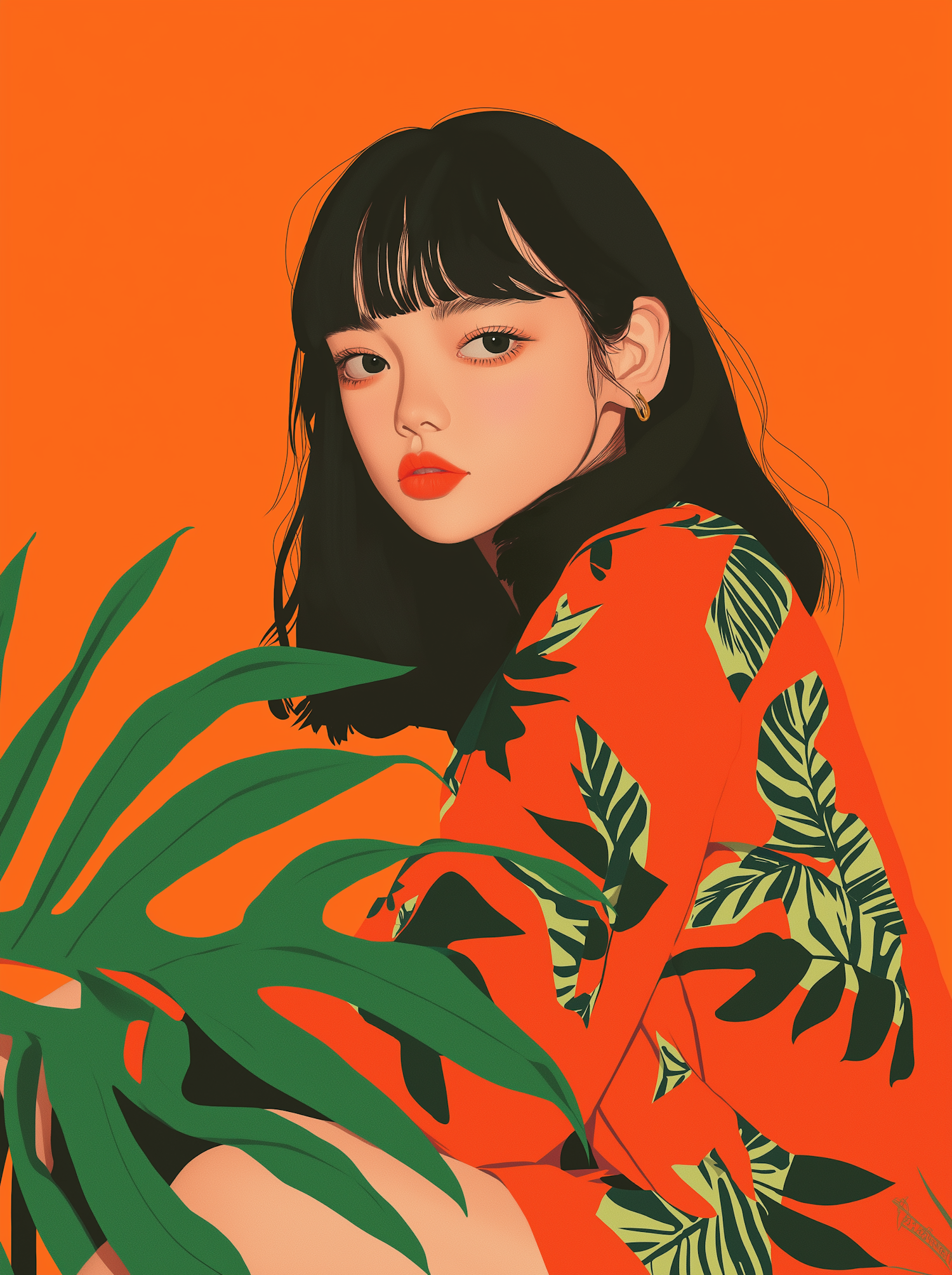 Stylish illustration of a woman in a tropical orange outfit with green leaves, set against a bold orange background.