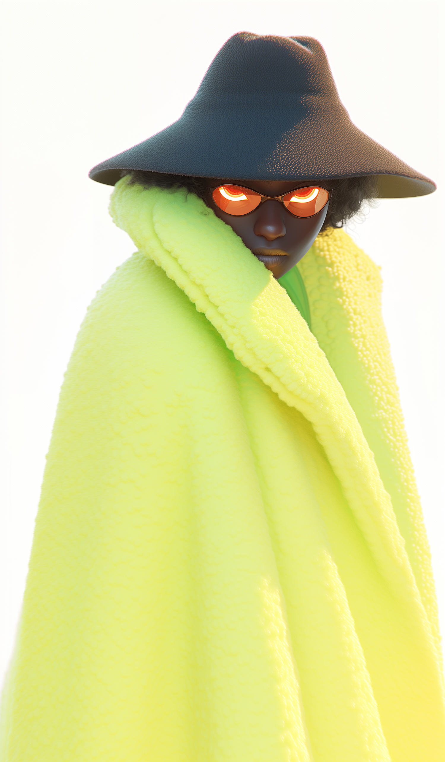 A person in a wide-brimmed hat, reflective glasses, and bright yellow fabric creates a bold and futuristic look against a minimal background.