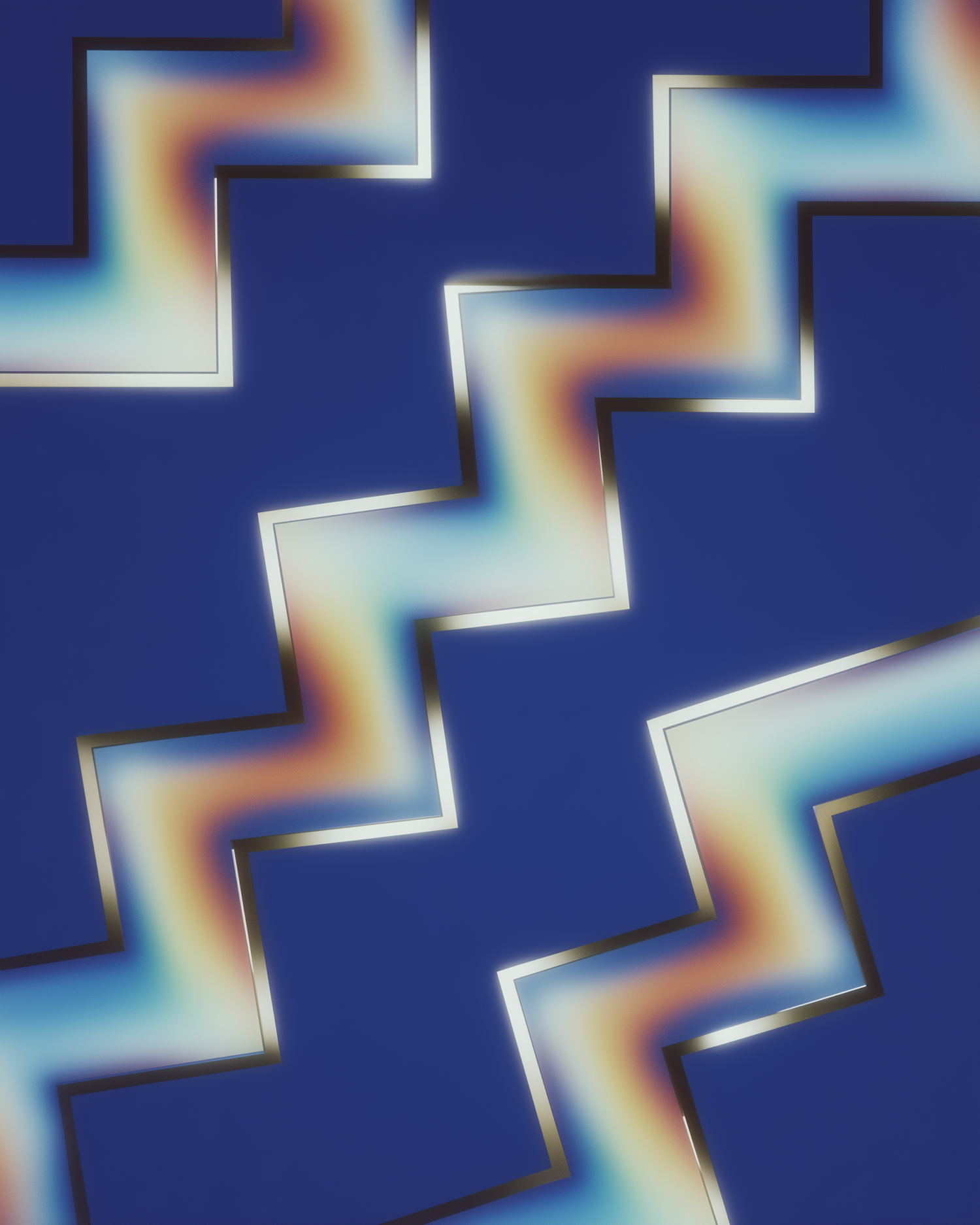 Abstract zigzag pattern with glowing gradients on a deep blue background, blending vibrant colors like red, orange, and blue.
