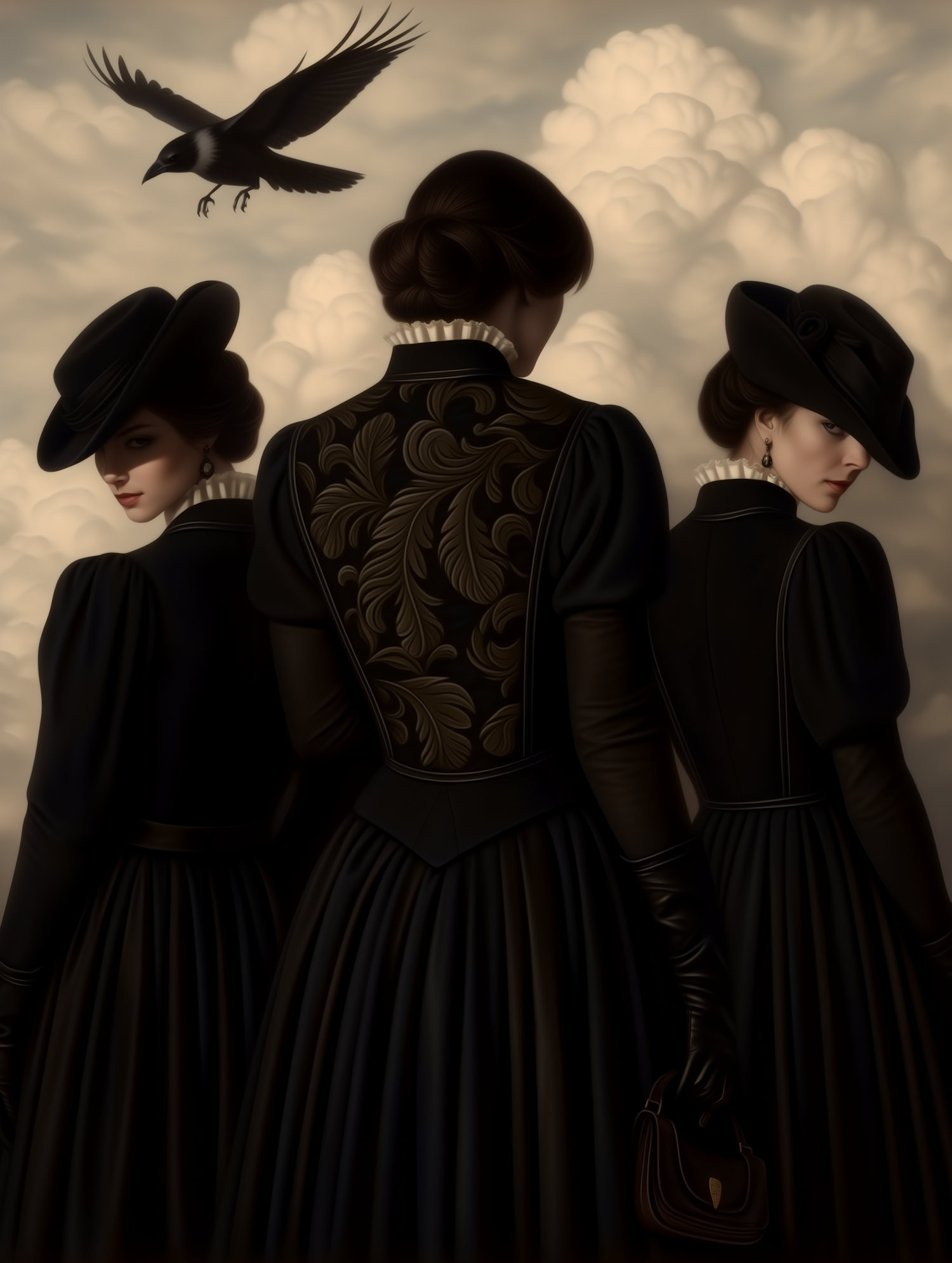Three women in Victorian-style black dresses stand under a cloudy sky, with a black bird flying above, creating a mysterious atmosphere.