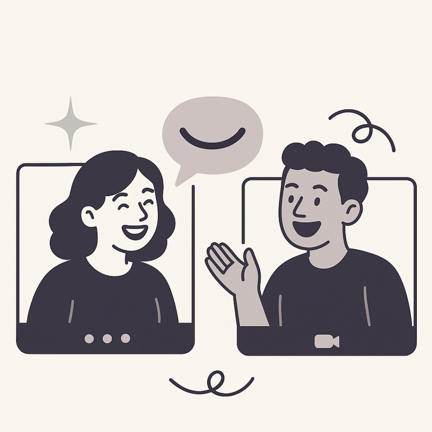 Minimalist illustration of two people on a video call, smiling and chatting, with playful speech bubbles and clean monochromatic design.