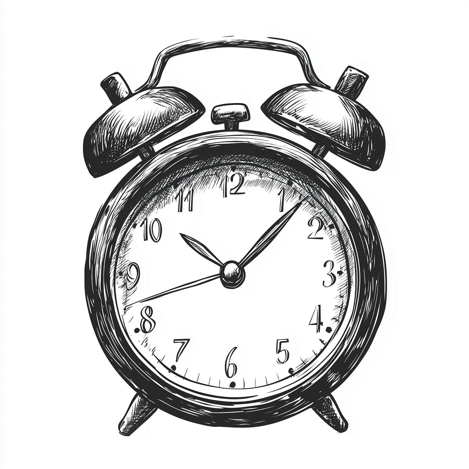 Vintage-style black-and-white sketch of a classic alarm clock with intricate details and a retro aesthetic on a plain white background.