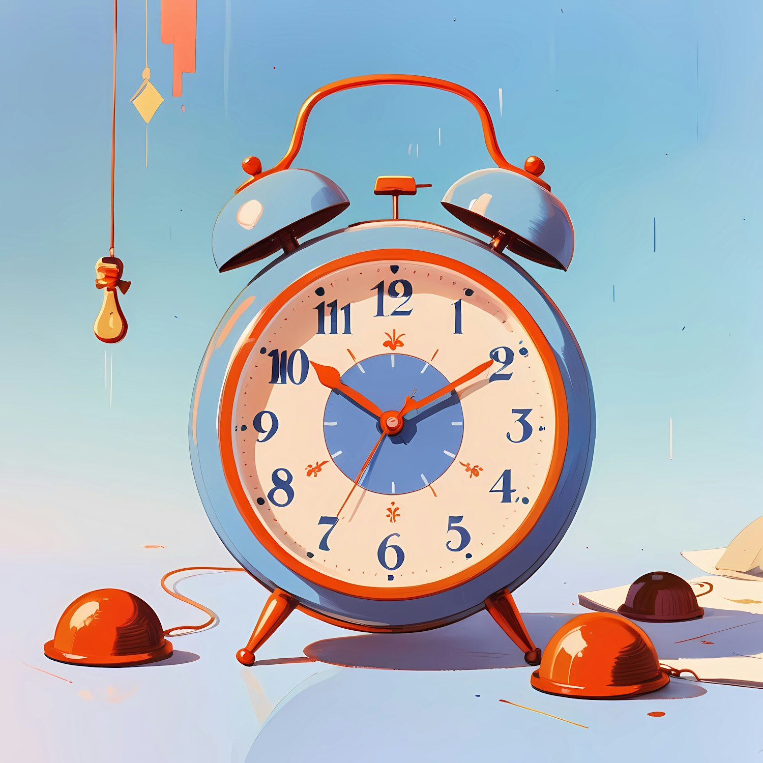 A playful illustration of a vintage alarm clock in blue and orange, surrounded by whimsical details and a dreamy blue background.
