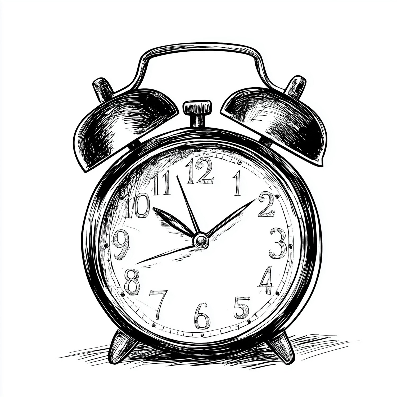 Hand-drawn black-and-white illustration of a vintage analog alarm clock with bold numbers and intricate shading details.