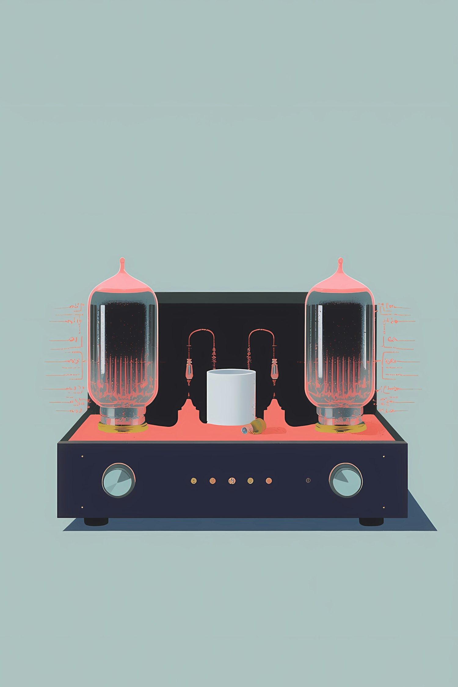 Stylized illustration of a retro audio amplifier with glowing vacuum tubes, blending vintage design with modern aesthetics.