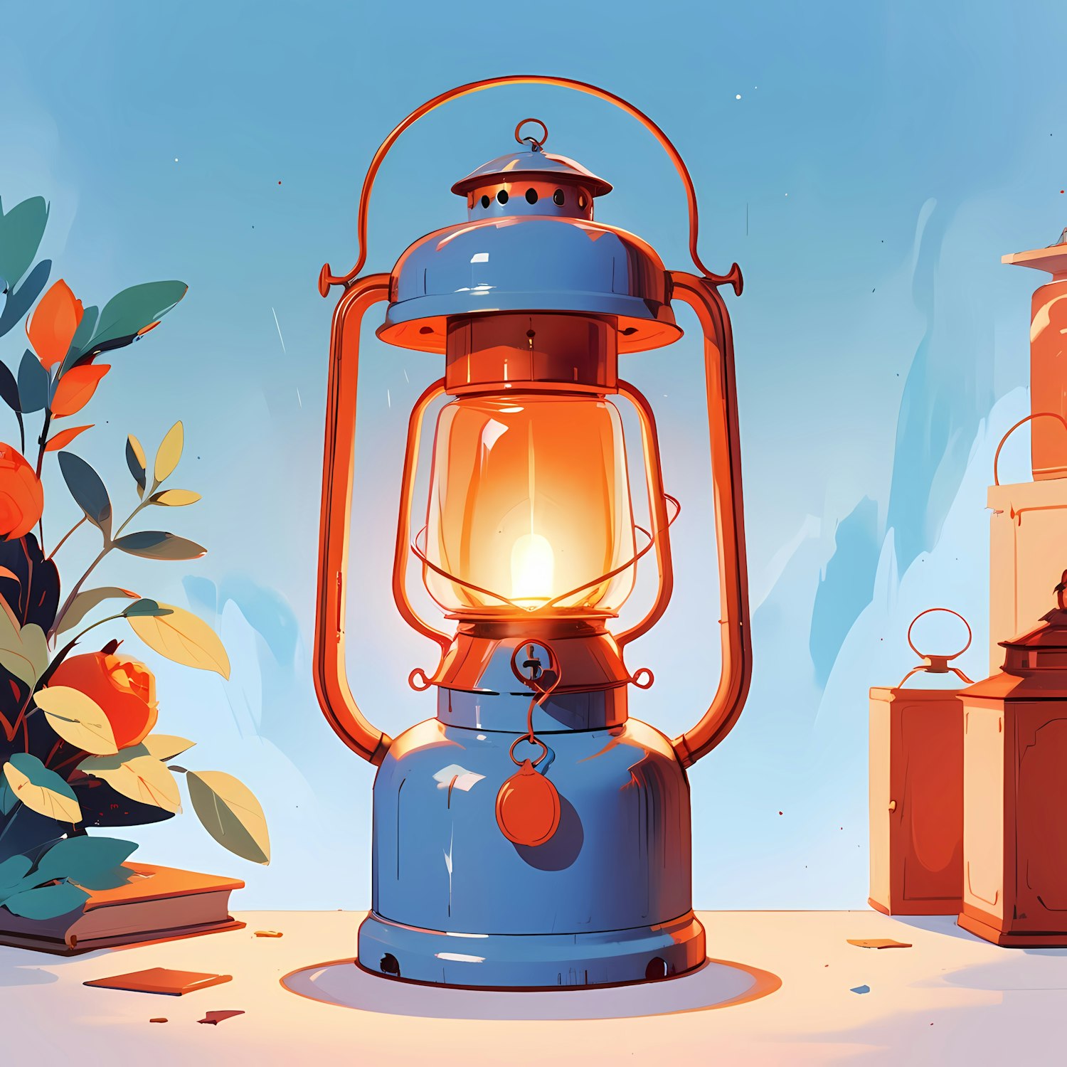 A glowing vintage blue lantern with orange light, surrounded by fruits, leaves, and books, set against a soft blue background.