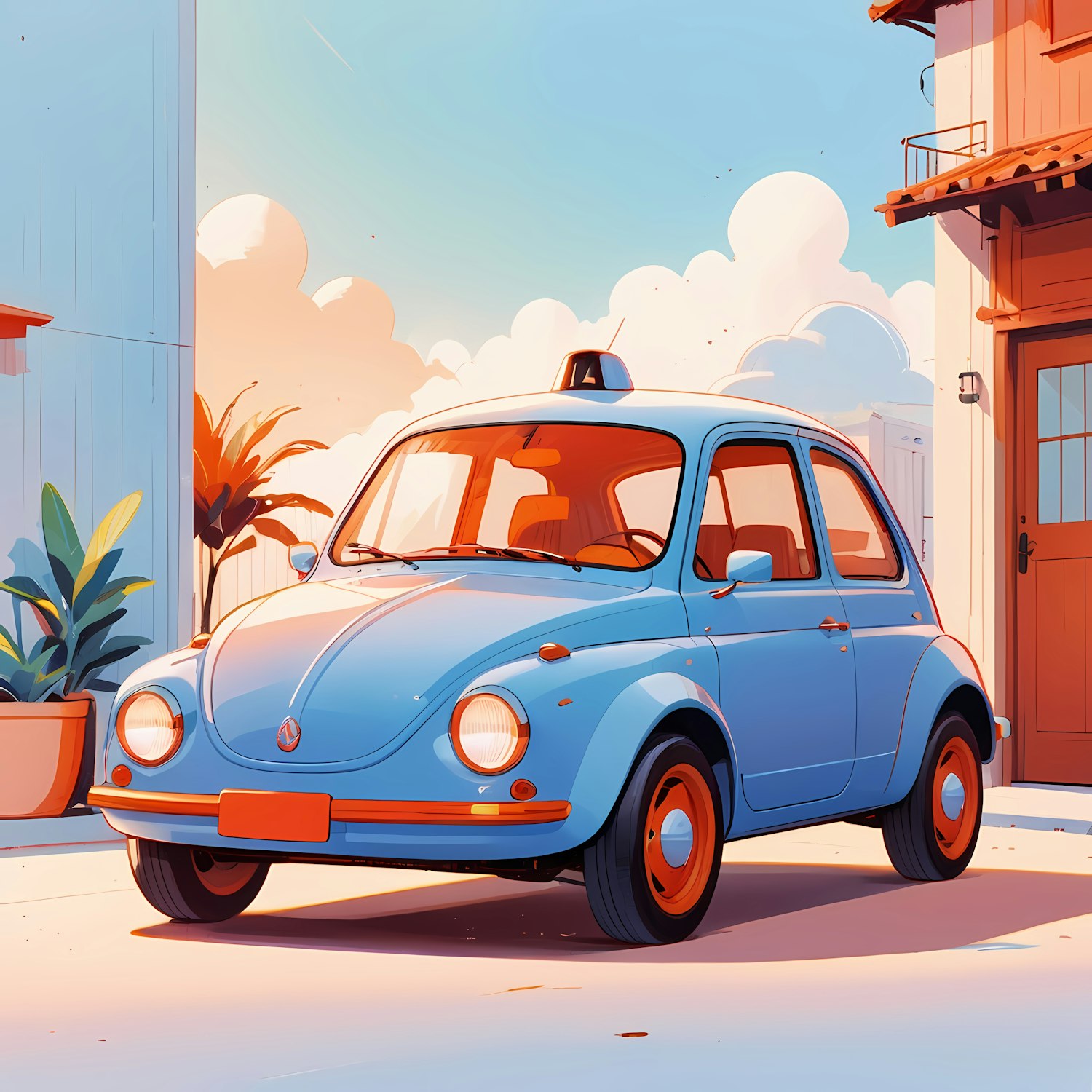 Vintage blue car with orange accents parked in a sunny suburban setting, featuring a taxi sign and cozy architectural details.