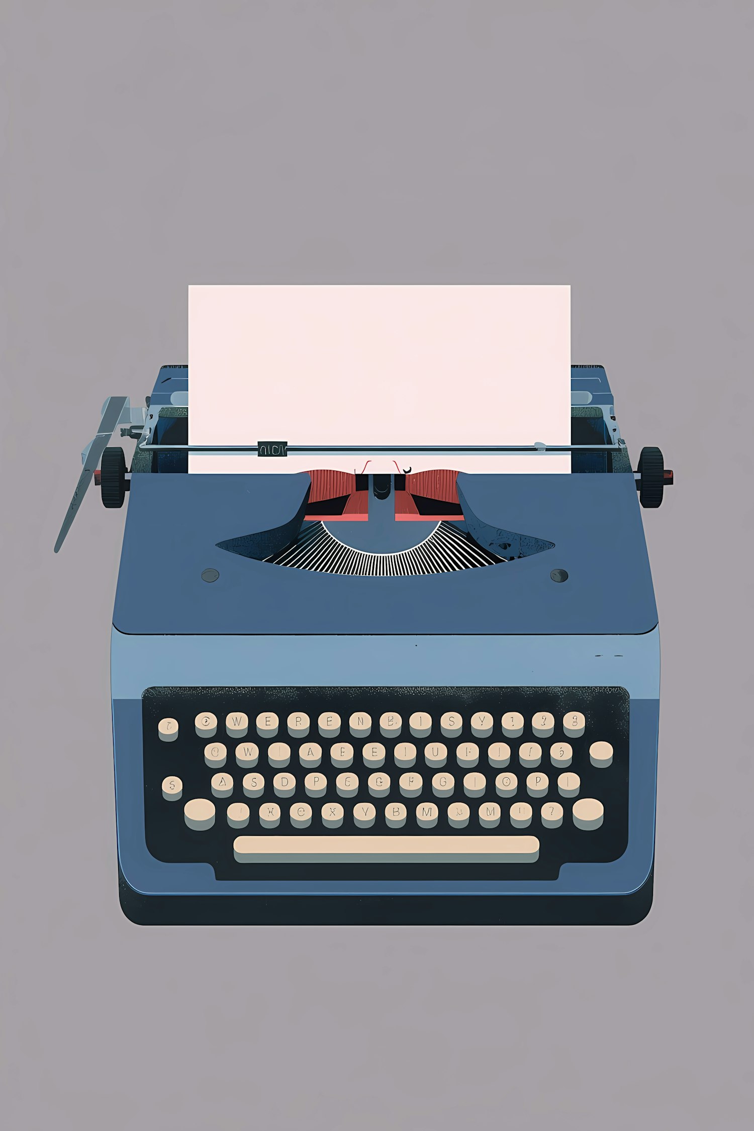 Minimalist illustration of a vintage blue typewriter with cream keys and a blank paper sheet, set against a neutral gray background.