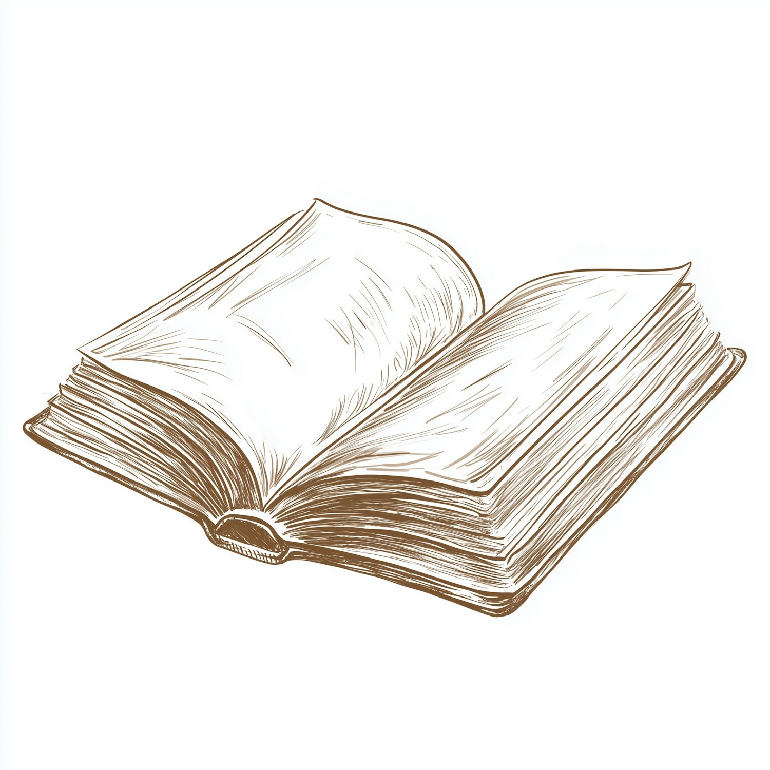 Vintage-style sepia illustration of an open book with detailed pages on a white background, perfect for literary or artistic themes.
