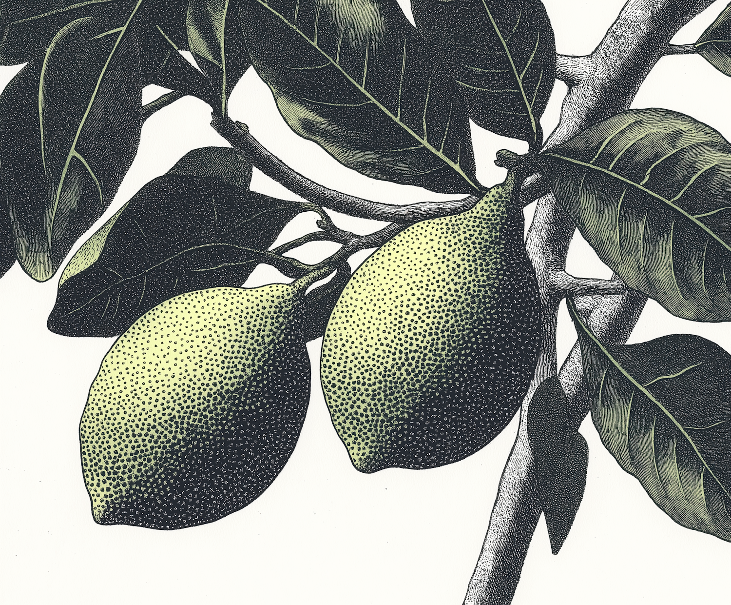 Intricate illustration of lemons on a branch with lush green leaves, showcasing detailed textures and vibrant colors.