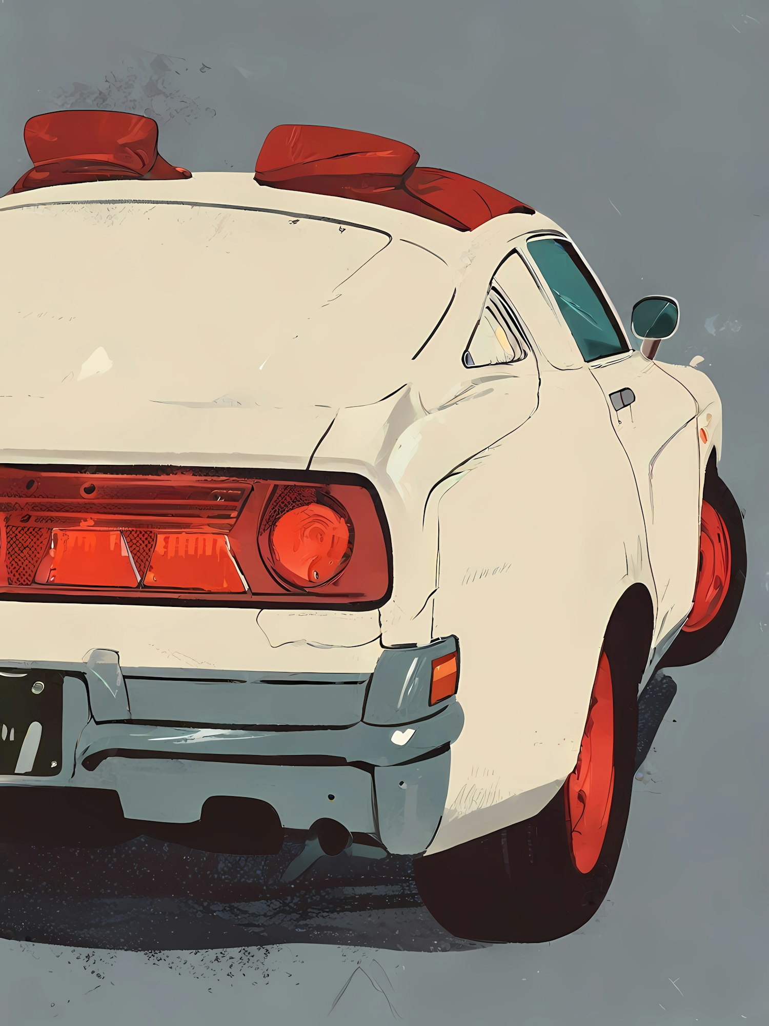 Stylized illustration of a vintage white car with red accents and wheels, set against a muted gray background.