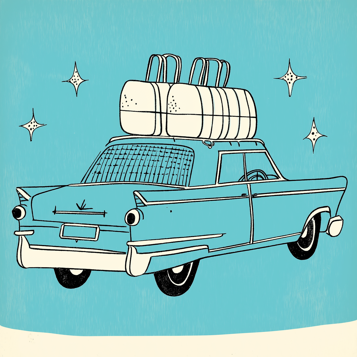 Retro illustration of a classic car with luggage on top, set against a turquoise background with star accents.