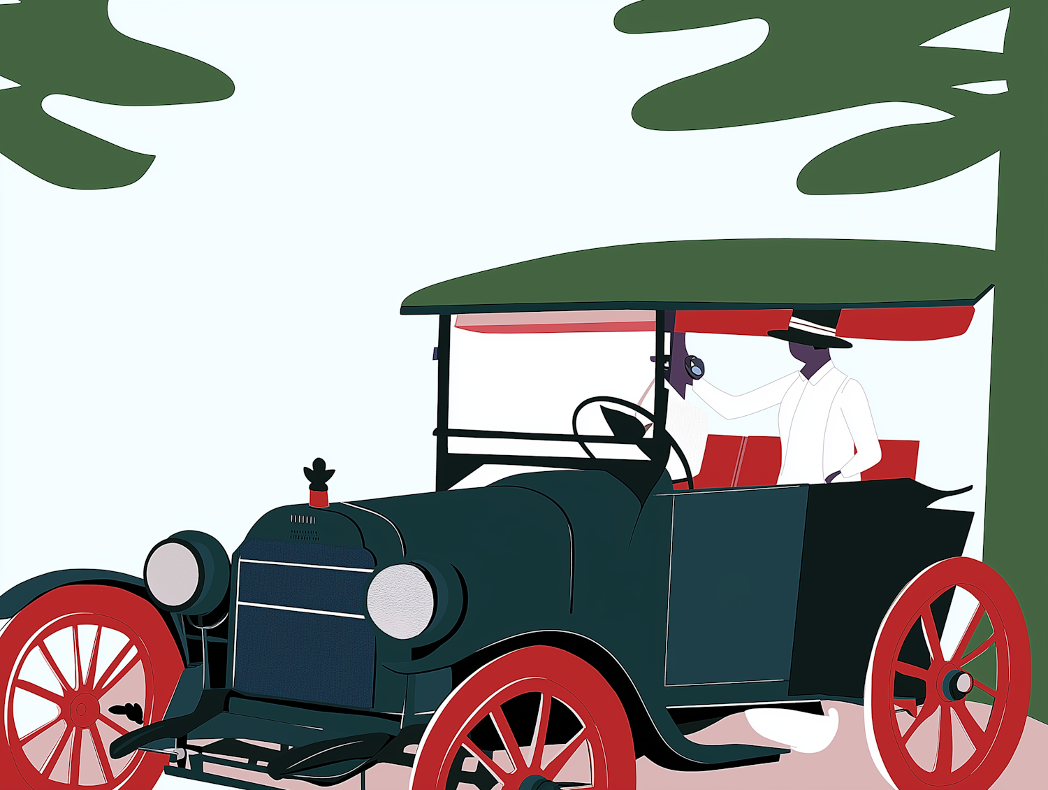 Stylized illustration of a vintage car with red wheels, a green body, and a driver in a white outfit under a canopy roof.