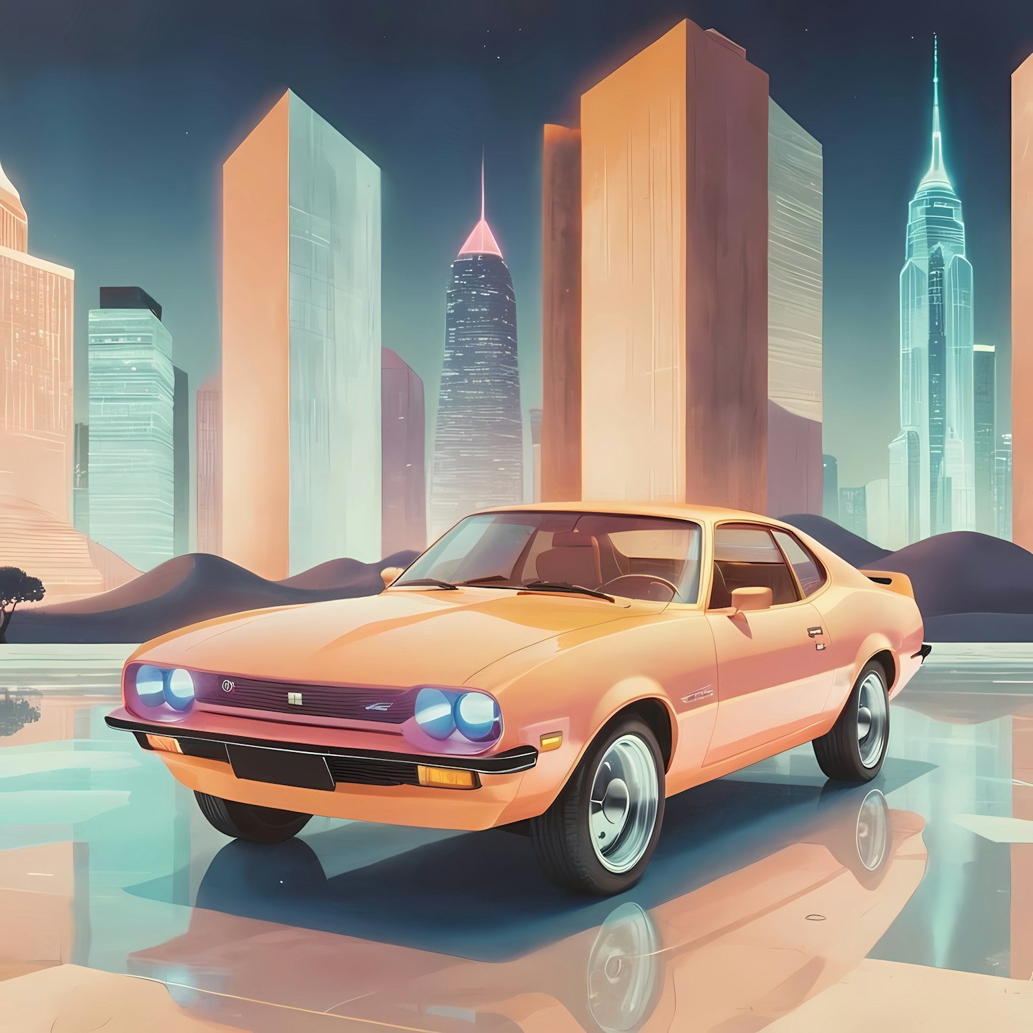 Vintage peach car with blue headlights in a futuristic cityscape, surrounded by towering golden skyscrapers and a reflective surface.