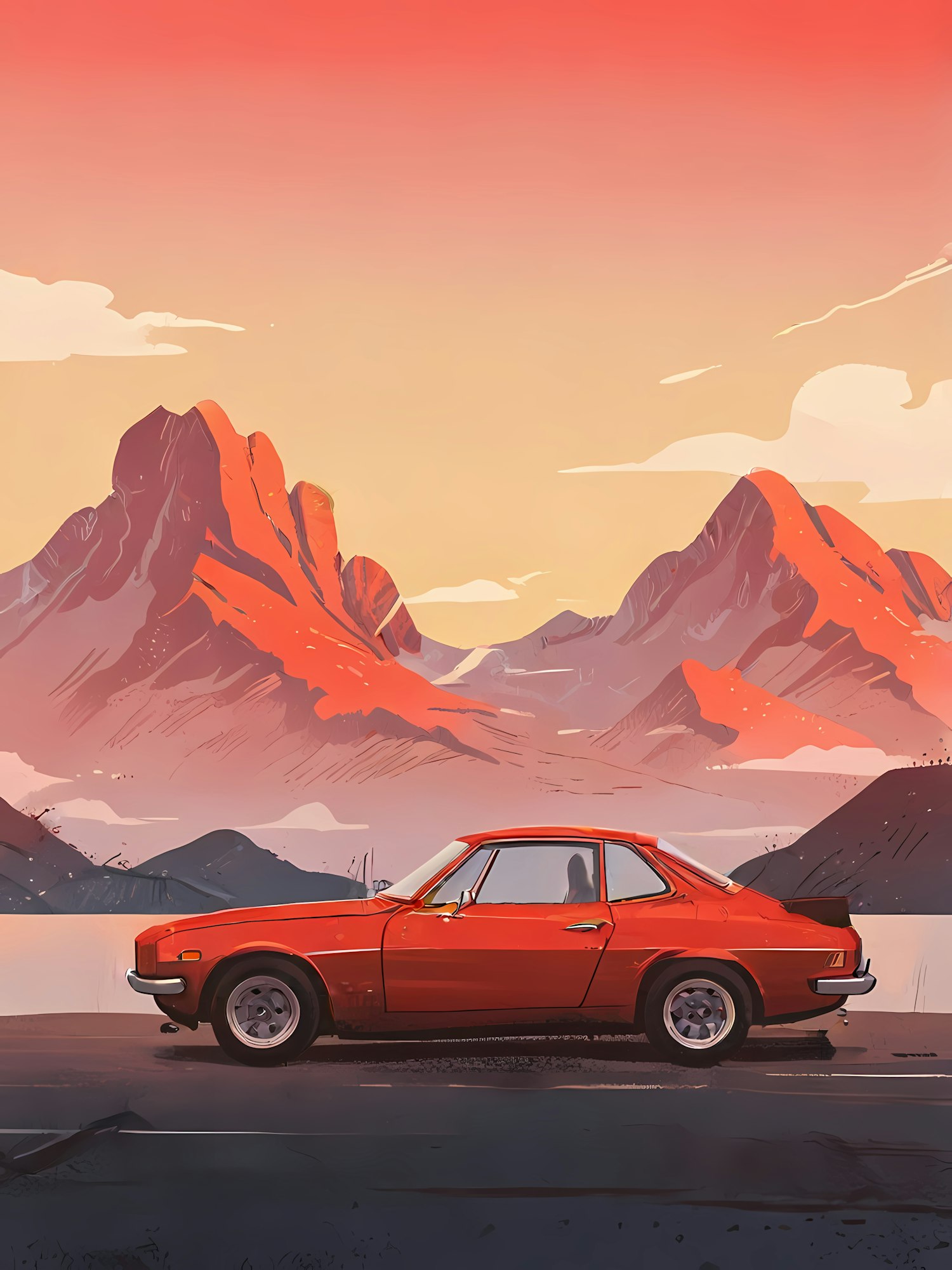 Illustration of a classic red sports car against a stunning orange and pink mountain backdrop, evoking adventure and nostalgia.