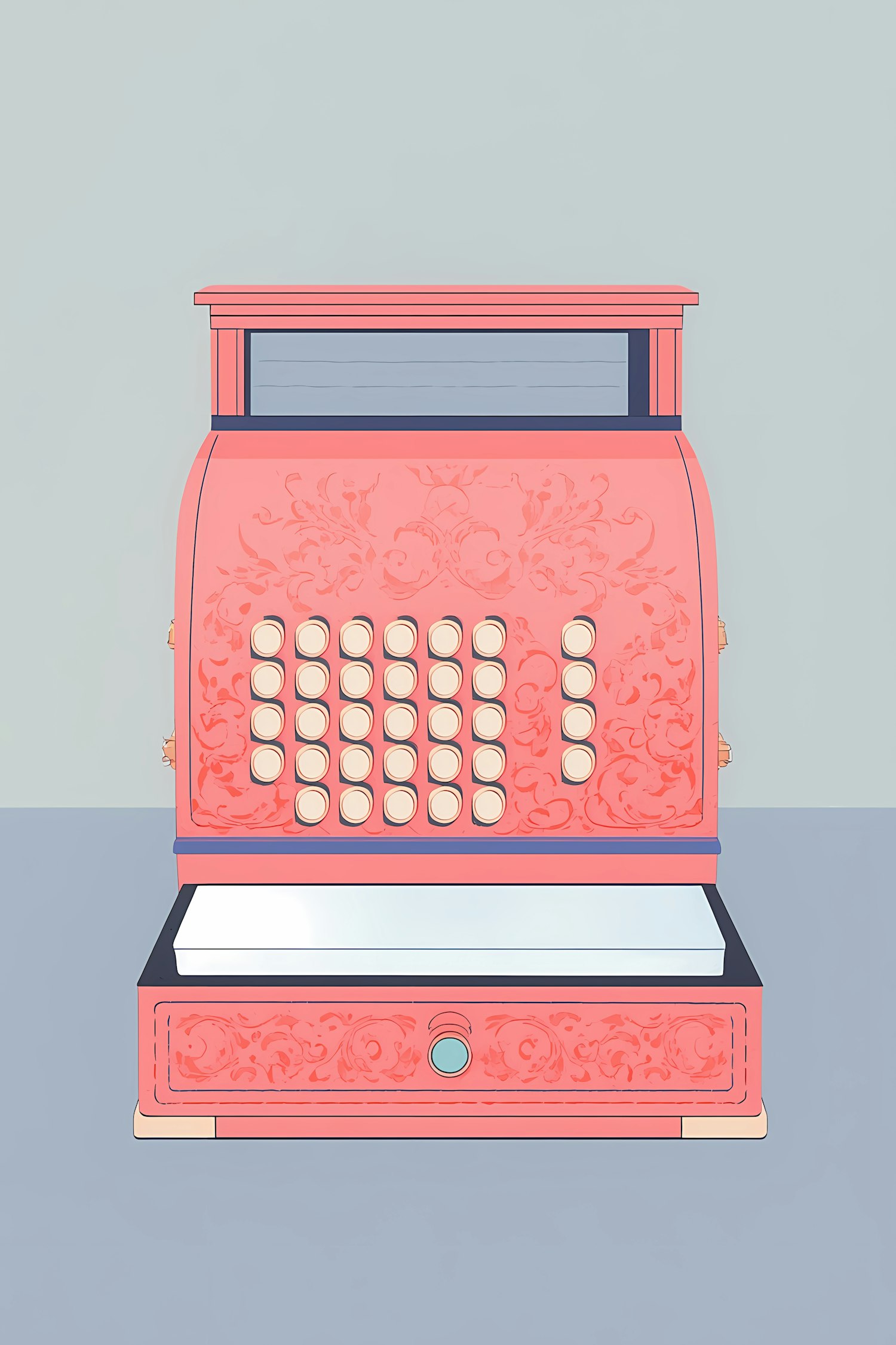 A beautifully illustrated vintage cash register in pink with ornate floral designs and cream-colored keys, set against a minimalist background.