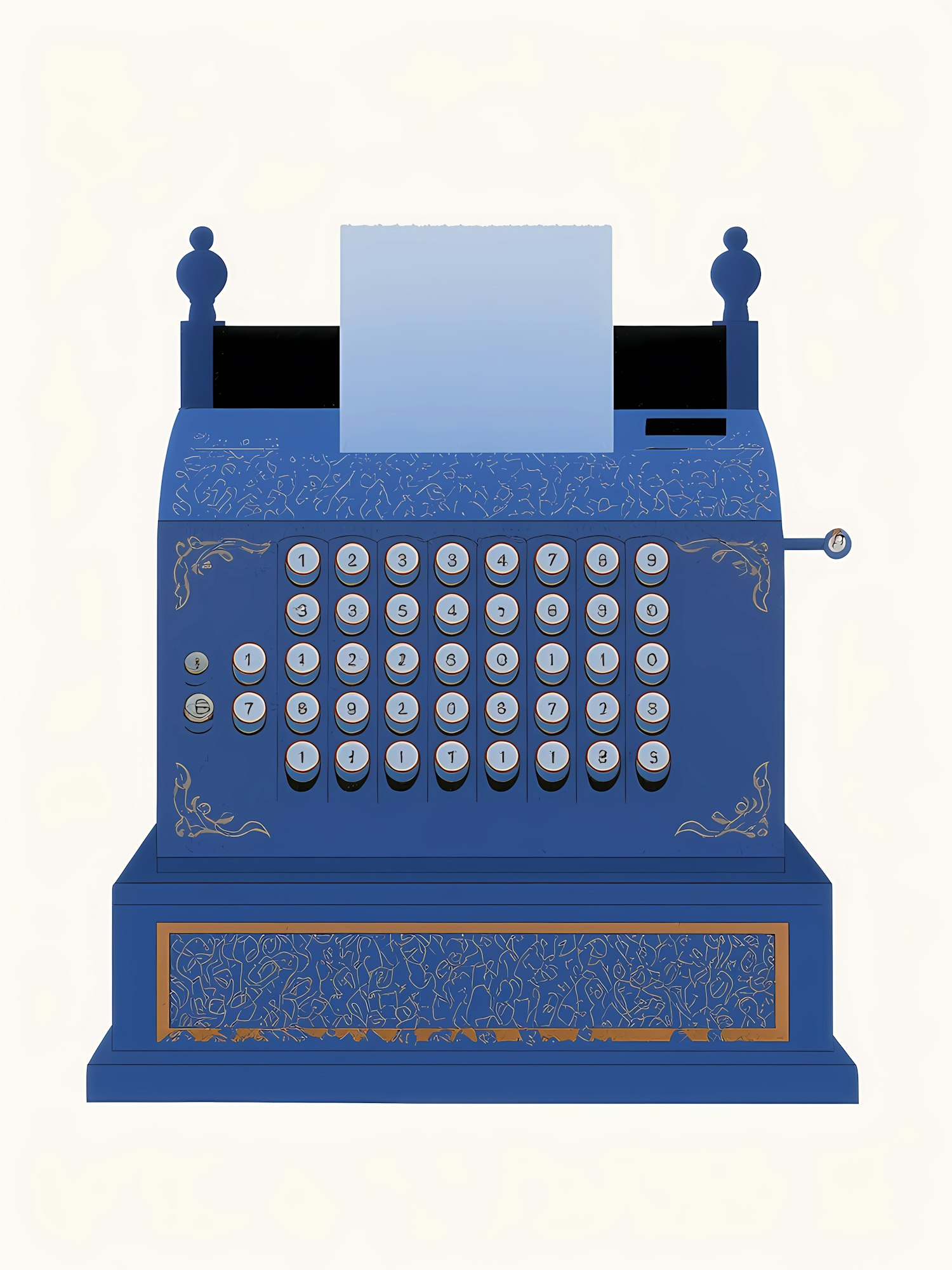 A vintage-style blue cash register with golden patterns and numbered keys, blending classic design with artistic details.