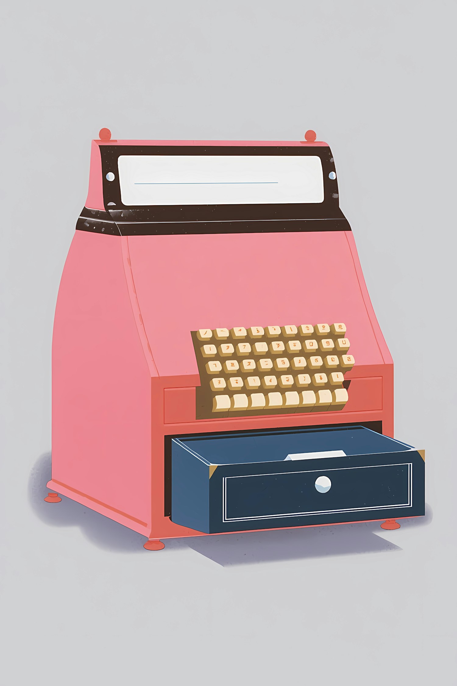 A colorful illustration of a vintage cash register with a pink body, cream keys, and a blue drawer, set against a light gray background.