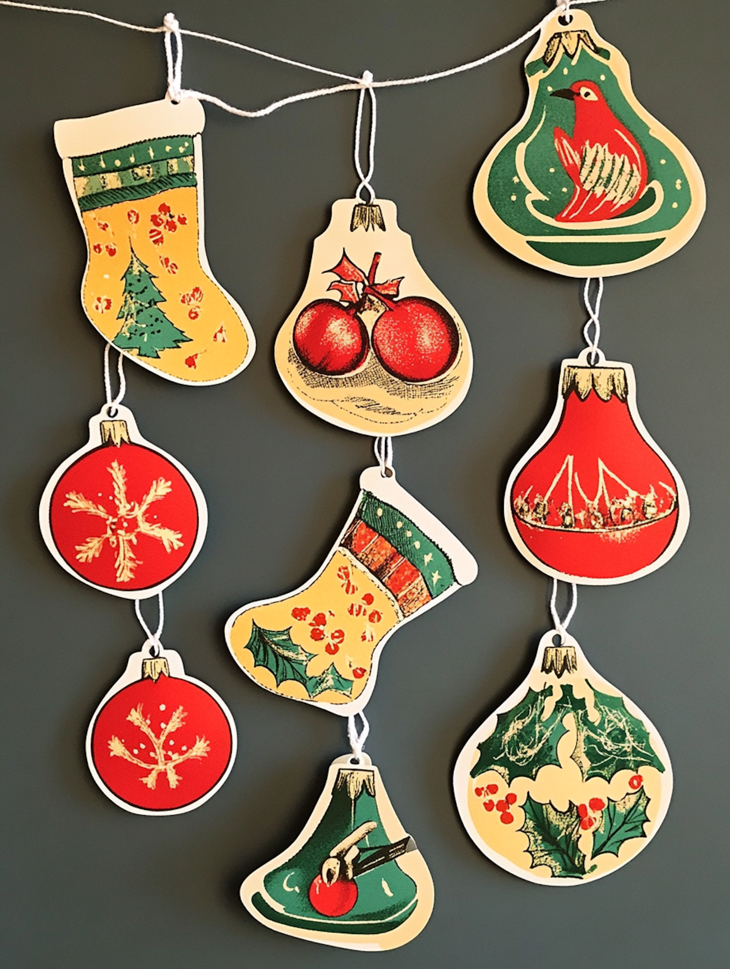 Vintage-style Christmas ornaments with festive designs hang on a string, featuring stockings, snowflakes, and holly in red, green, and yellow.