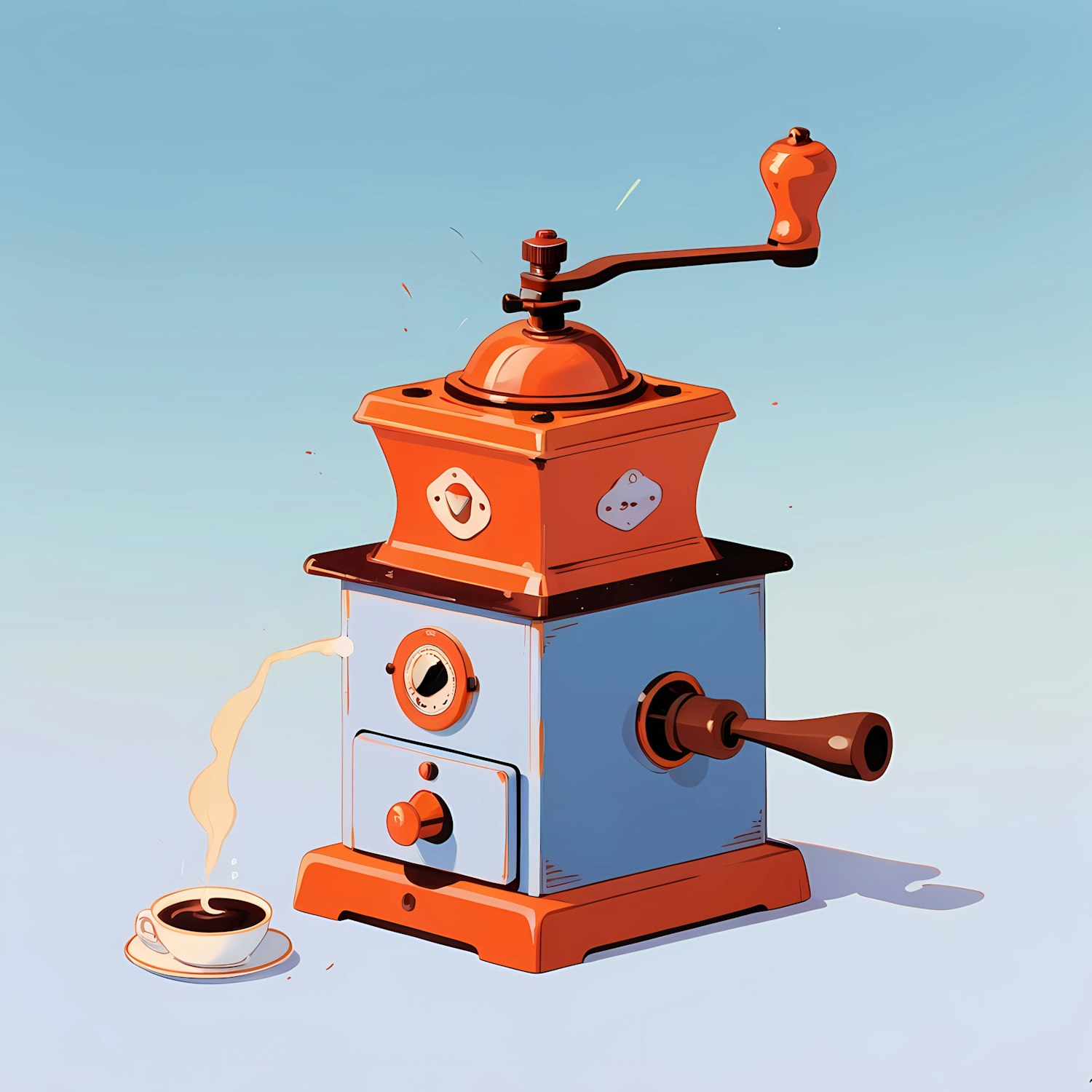 Playful illustration of a vintage coffee grinder pouring coffee into a cup, with vibrant orange and blue tones against a light blue background.