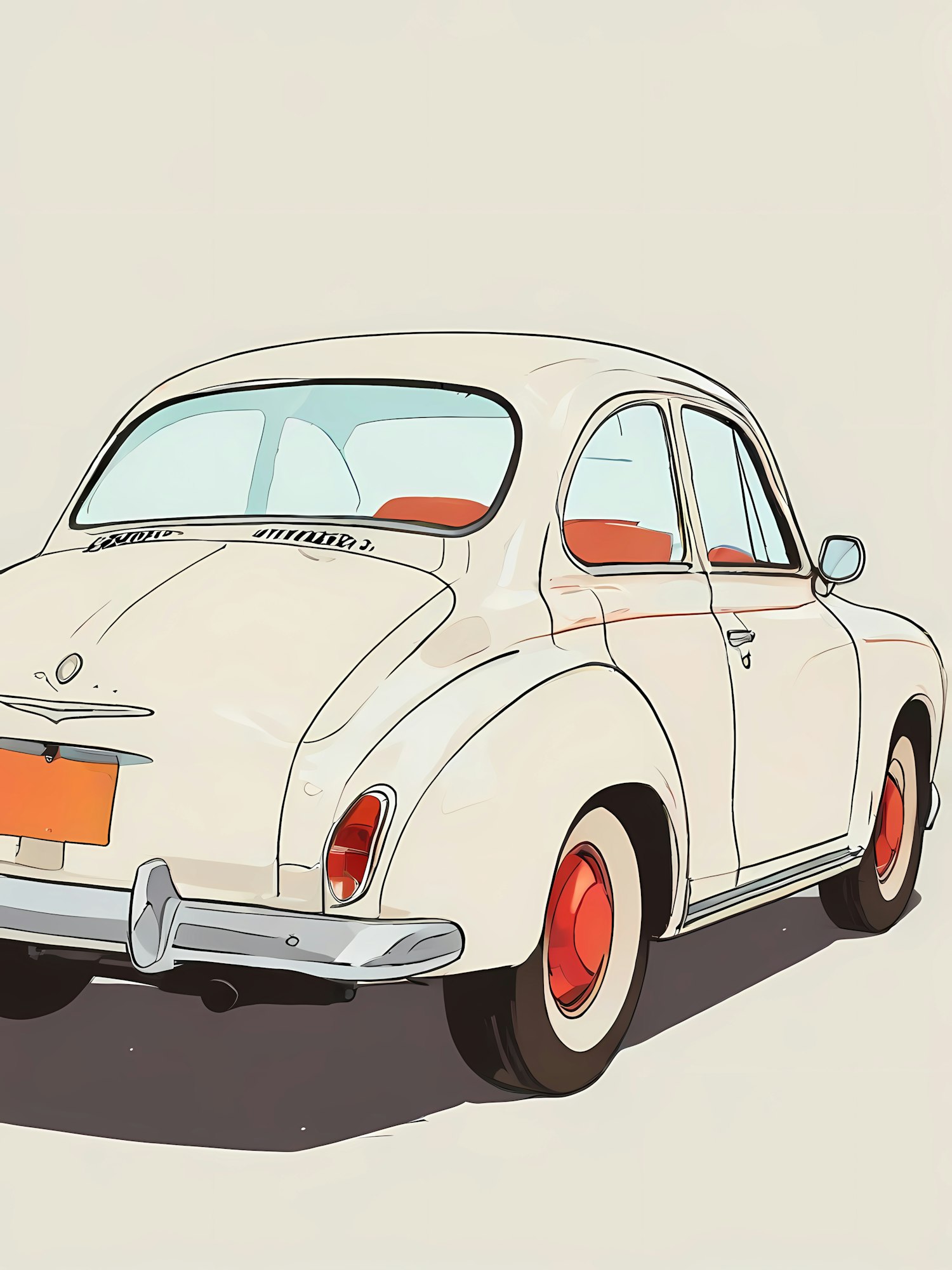Retro illustration of a vintage cream car with red hubcaps and chrome details, set against a light beige background.