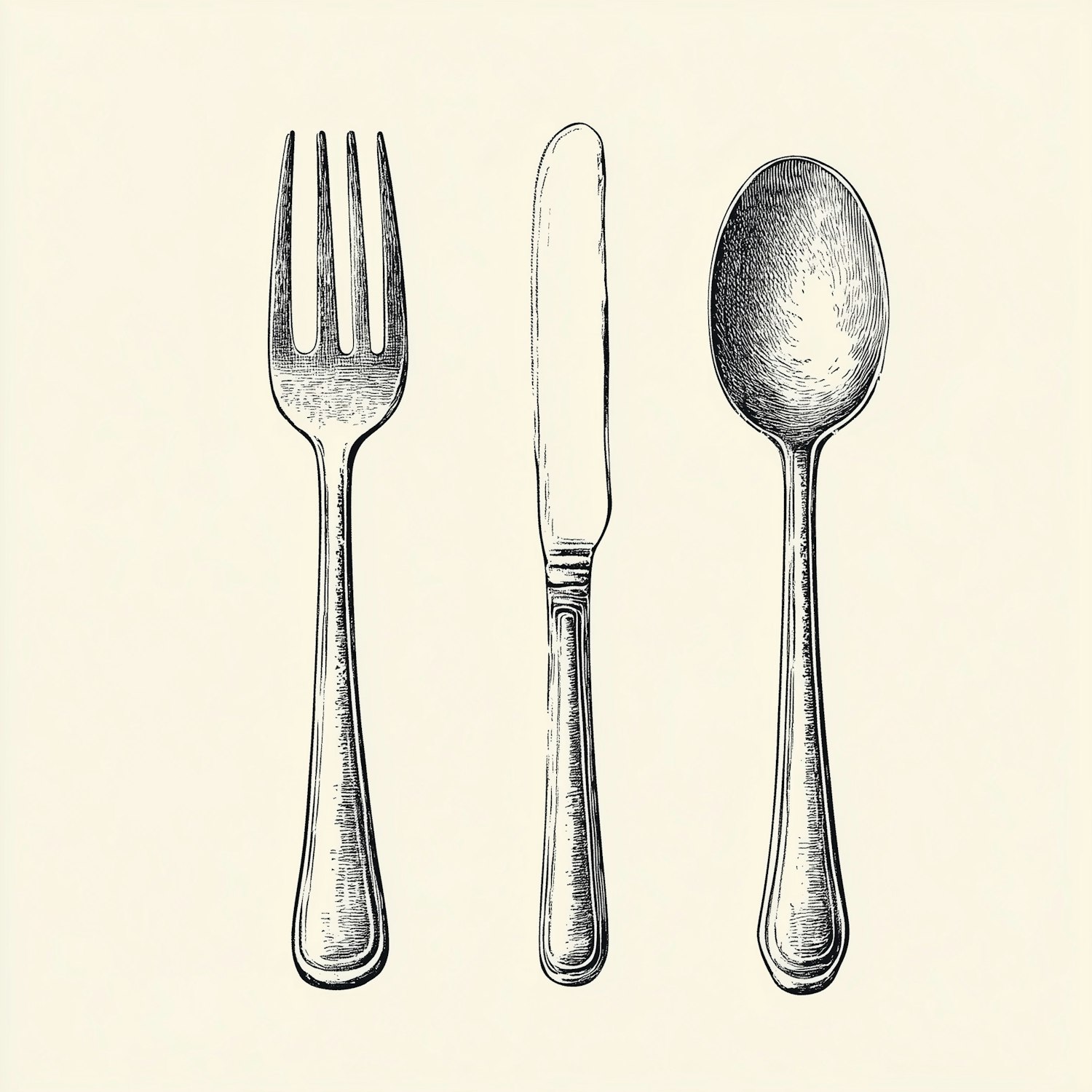 Vintage-style black-and-white illustration of a fork, knife, and spoon with intricate linework and elegant, simple handles.