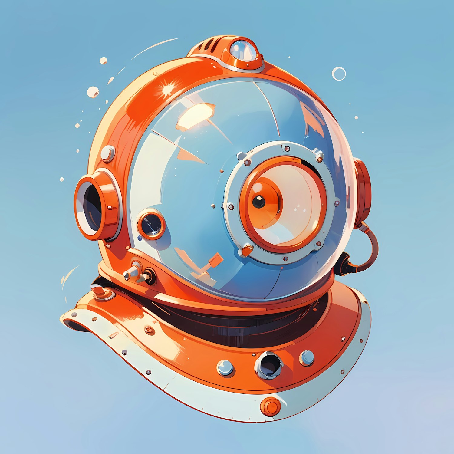 Whimsical illustration of a retro-futuristic orange diving helmet with a clear dome, set against a soft blue background with floating bubbles.