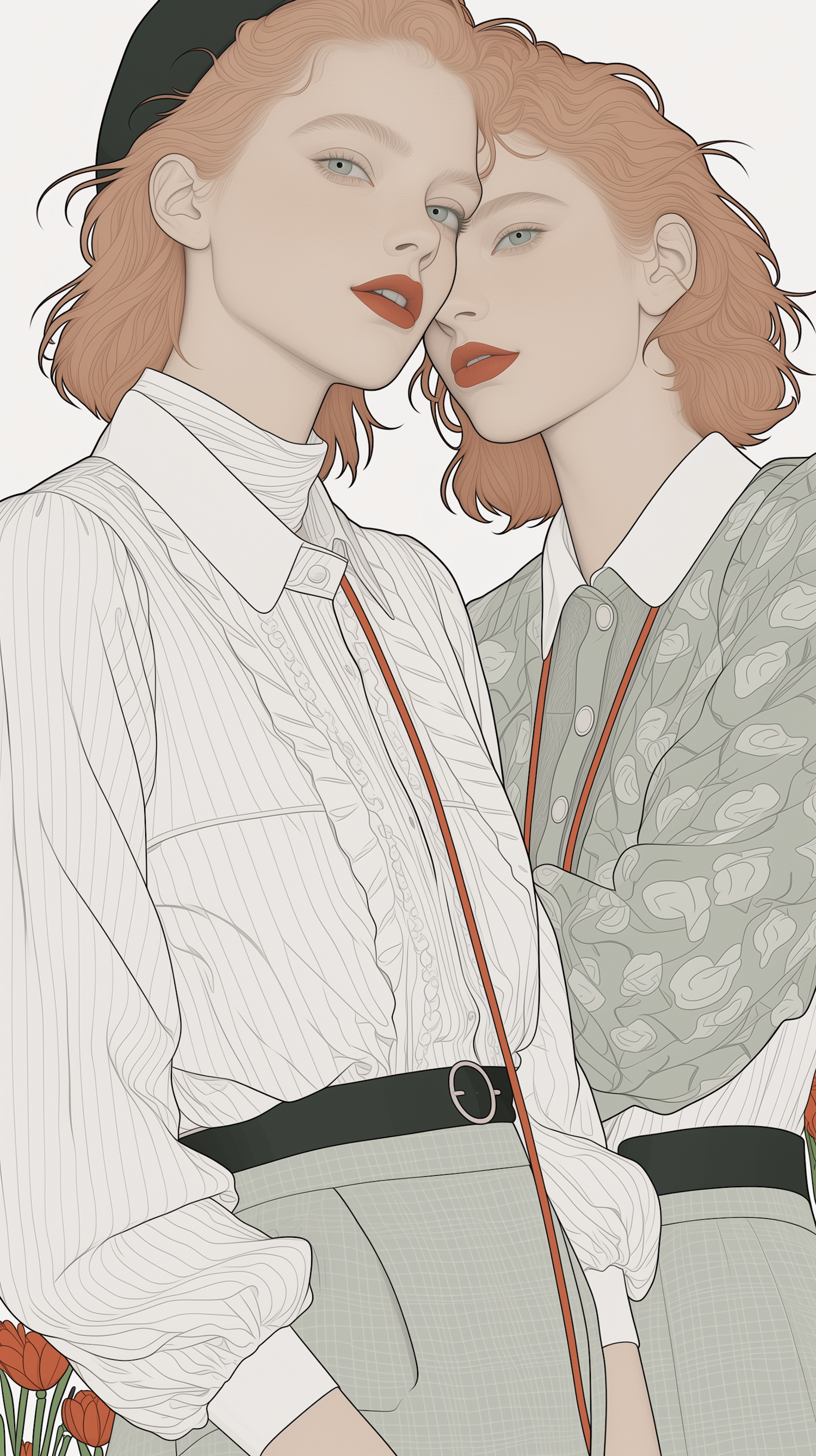 Stylish illustration of two red-haired individuals in vintage-inspired outfits, showcasing elegant details and a soft color palette.