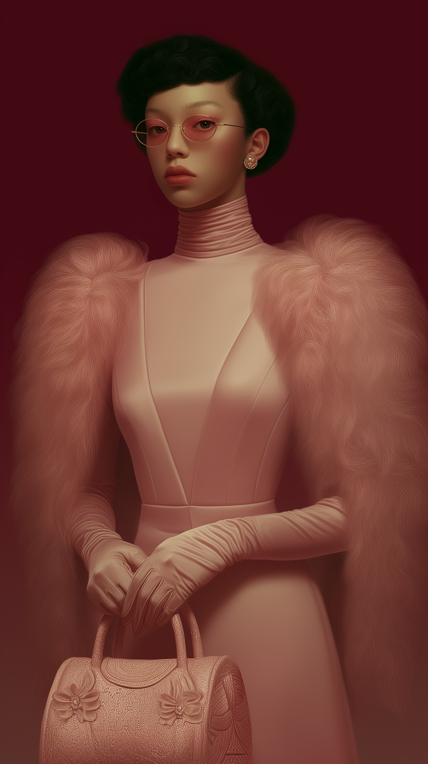 Stylized vintage portrait of a person in elegant attire with a fur stole, gloves, and a textured handbag, set against a burgundy background.