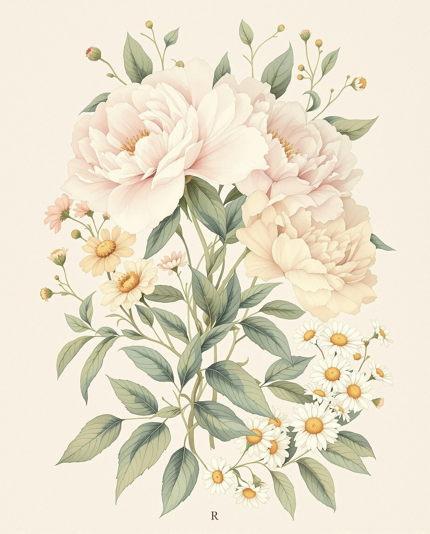 vintage-style botanical illustration, soft pastel flowers (peony, chamomile), ivory background, gentle shading, centered layout, no text, fine art