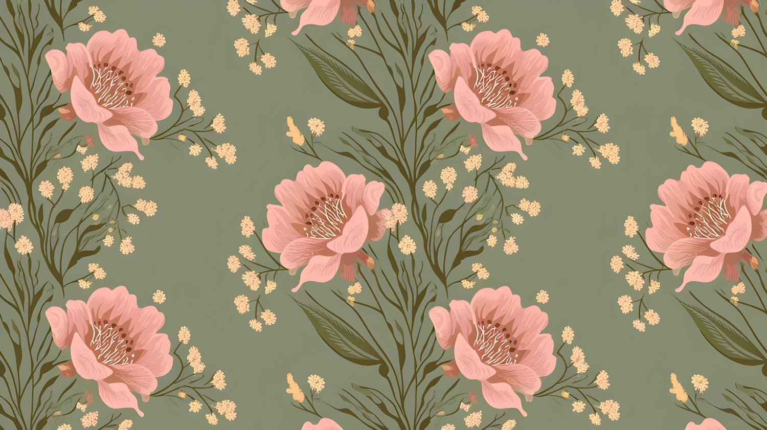 Elegant floral pattern with pink blooms, cream accents, and green leaves on a sage background. Perfect for vintage-inspired designs.