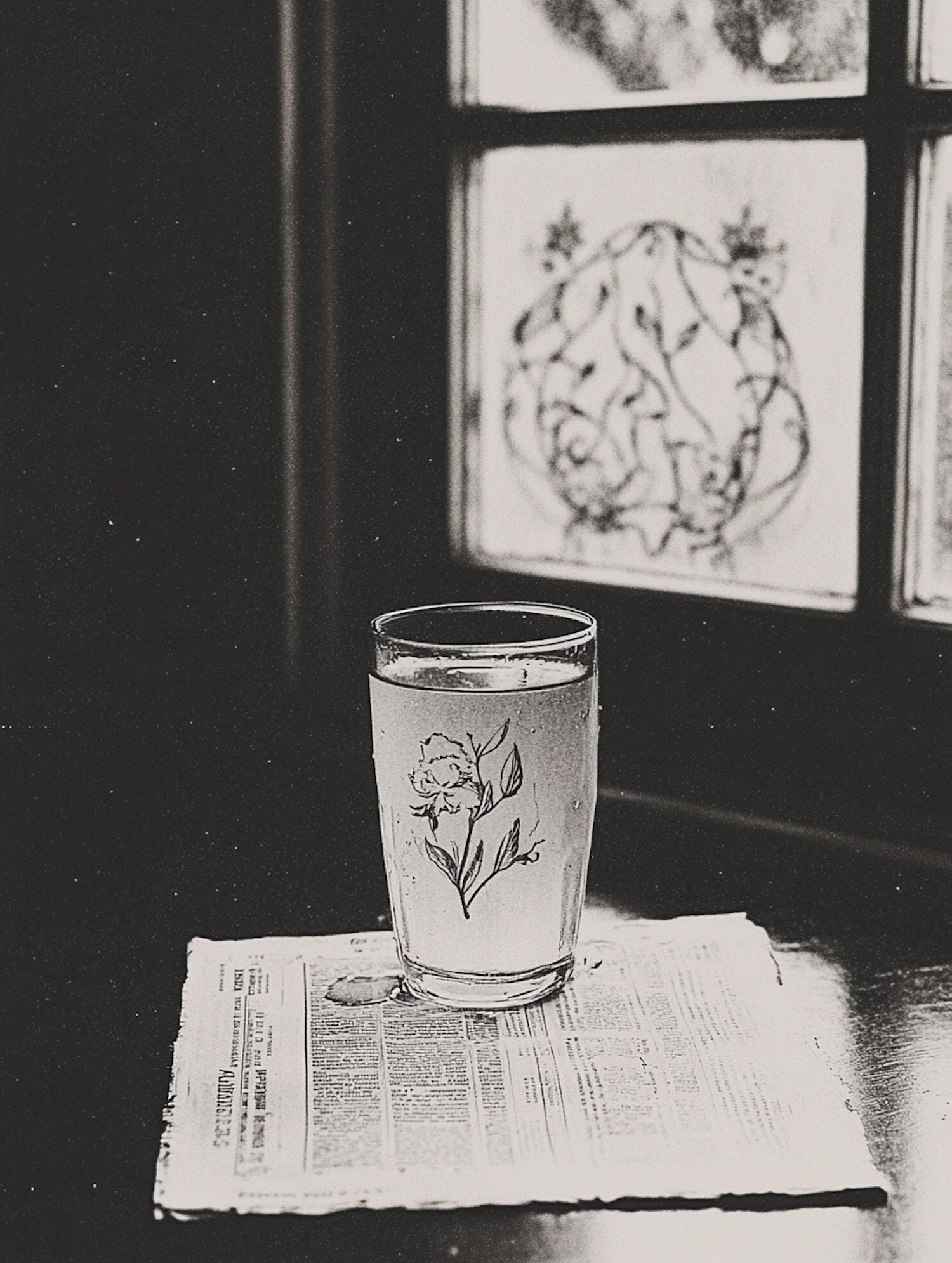A vintage black-and-white photo of a floral glass of water on a newspaper, with a frosted window featuring intricate patterns in the background.