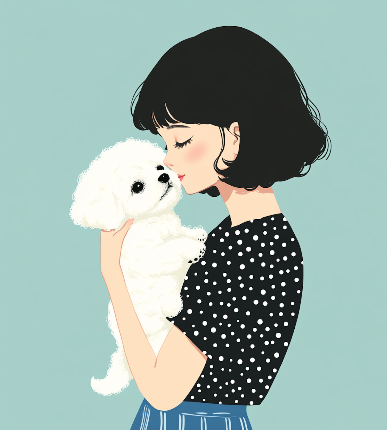 Illustration of a woman with short black hair kissing a fluffy white puppy against a teal background.