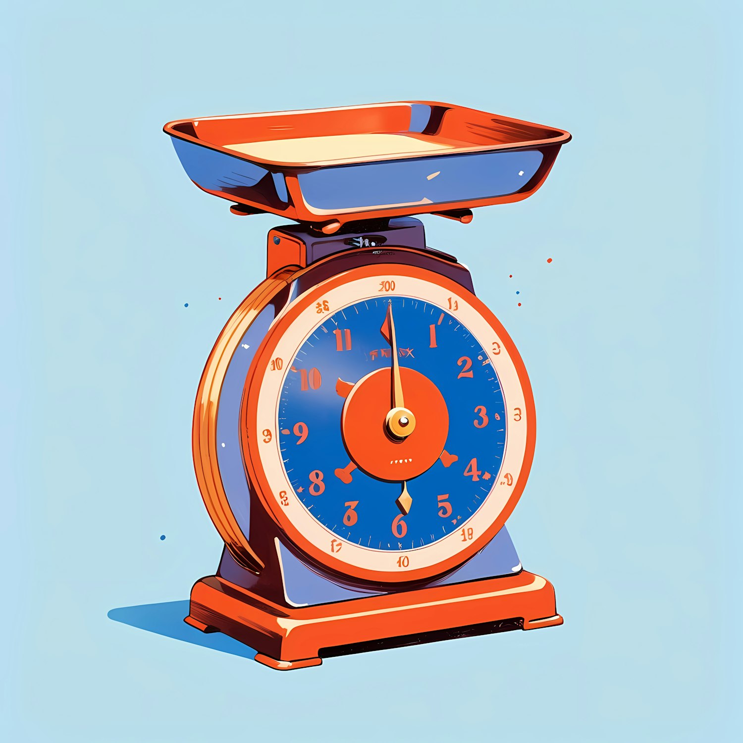 Retro kitchen scale illustration with bold blue and orange tones, a metallic tray, and a light blue background. Perfect vintage vibe!