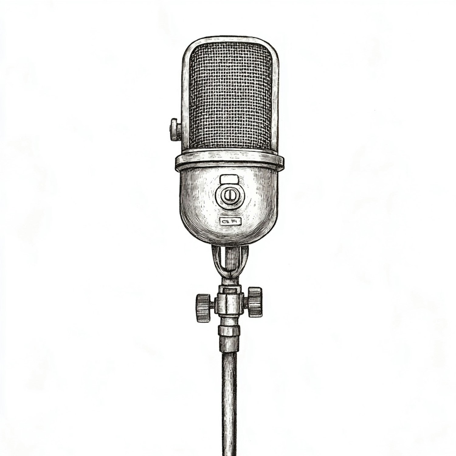 Detailed black-and-white illustration of a vintage microphone with fine cross-hatching, mounted on an adjustable stand.