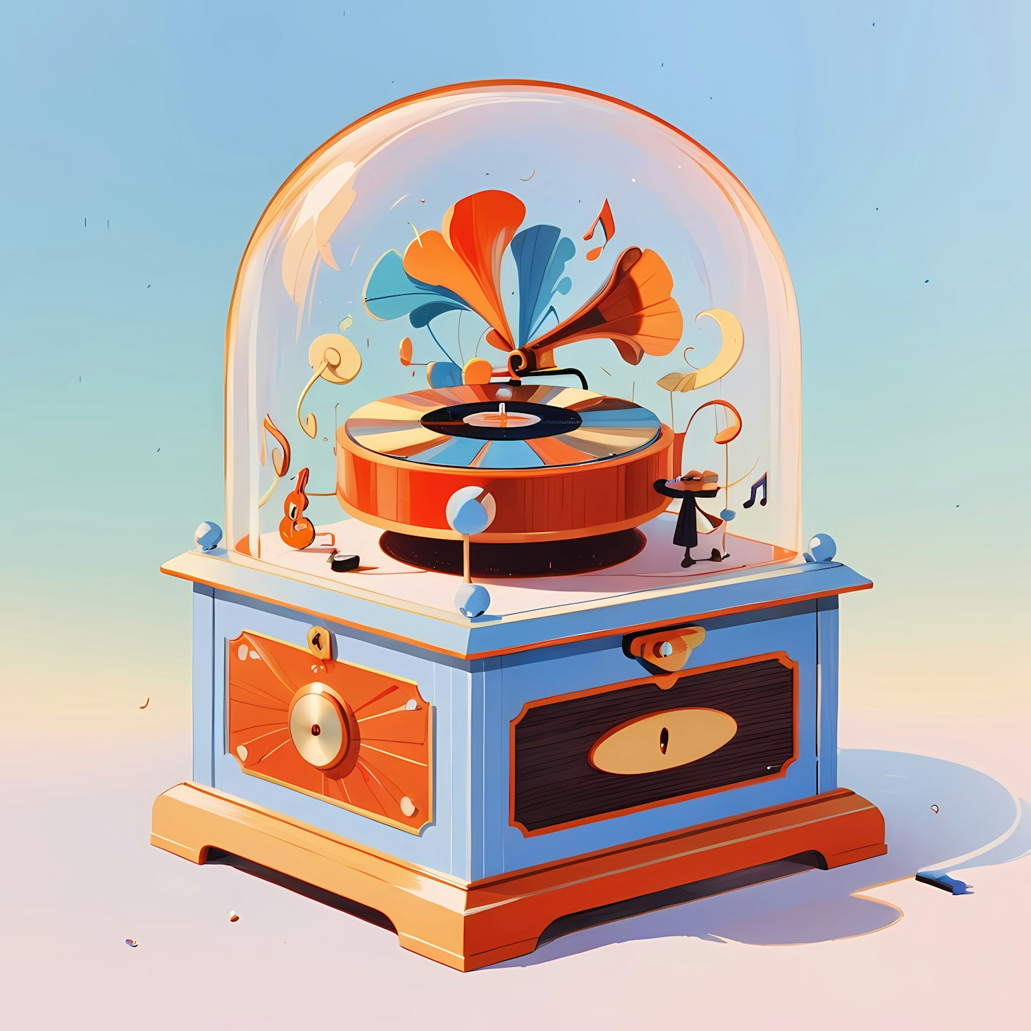 A colorful vintage music box illustration with a gramophone horn, floating musical notes, and a whimsical design under a glass dome.