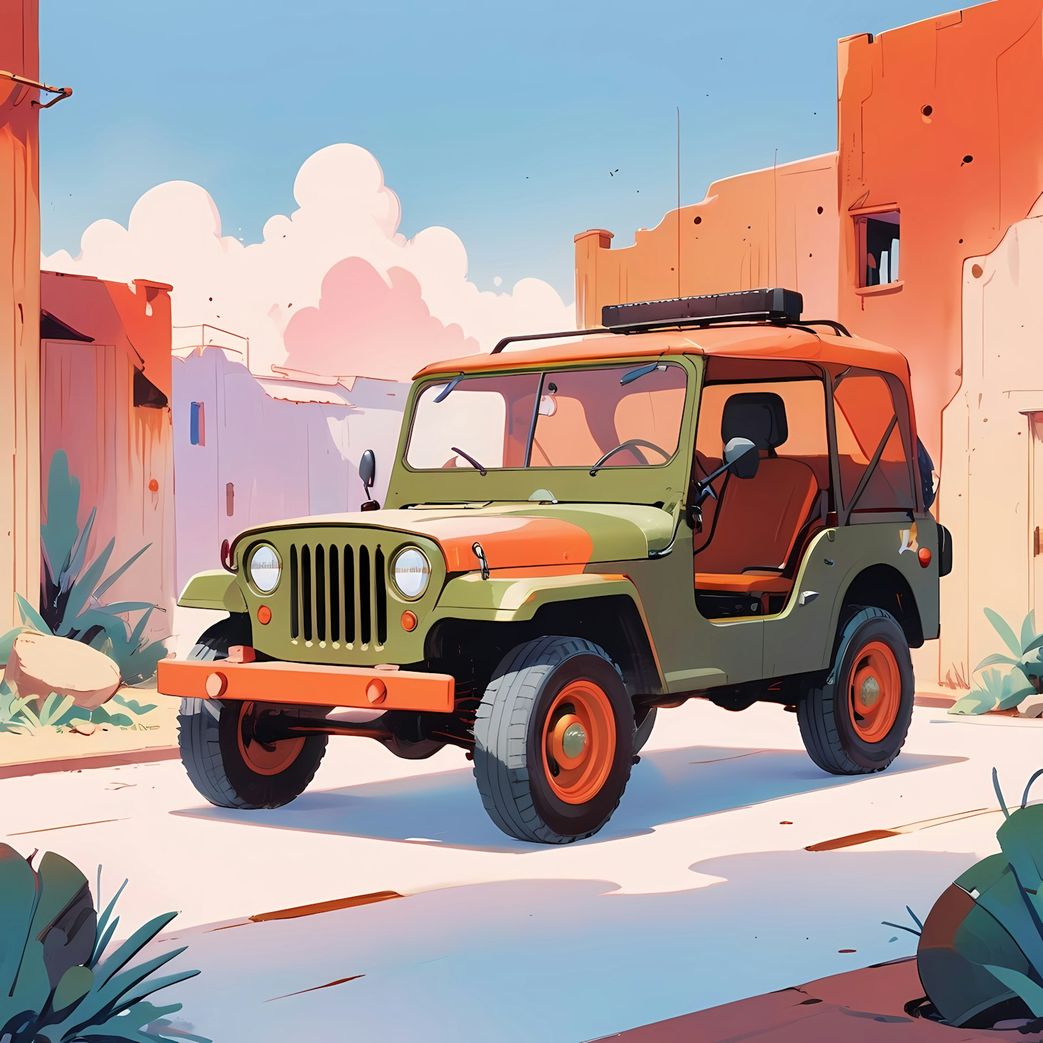Illustration of a vintage olive green and orange off-road vehicle in a sunny desert setting with adobe-style buildings and clear skies.