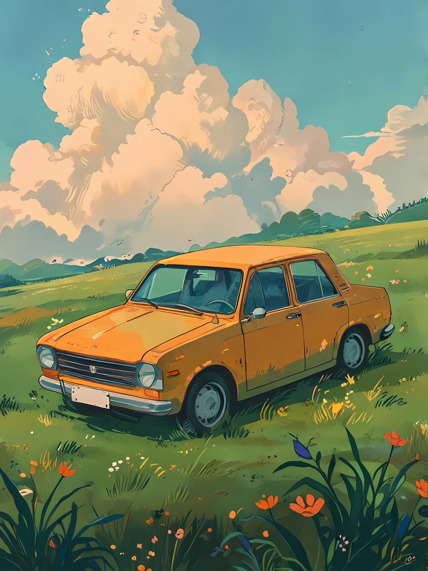 Illustration of a vintage orange car in a sunny meadow with wildflowers, rolling hills, and a dramatic sky with fluffy clouds.