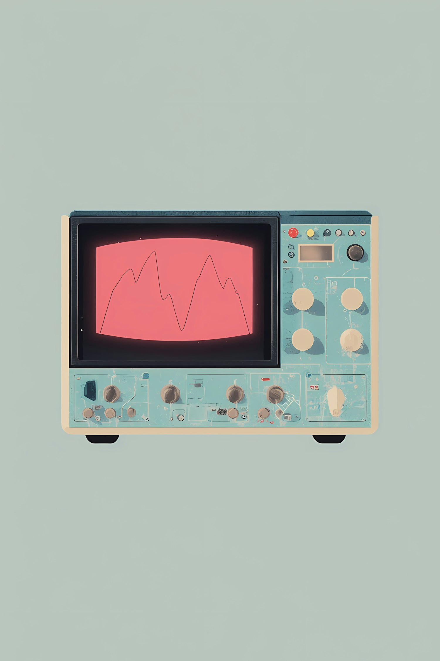 A retro-styled oscilloscope illustration with a red waveform display, light blue body, and beige accents on a muted gray background.