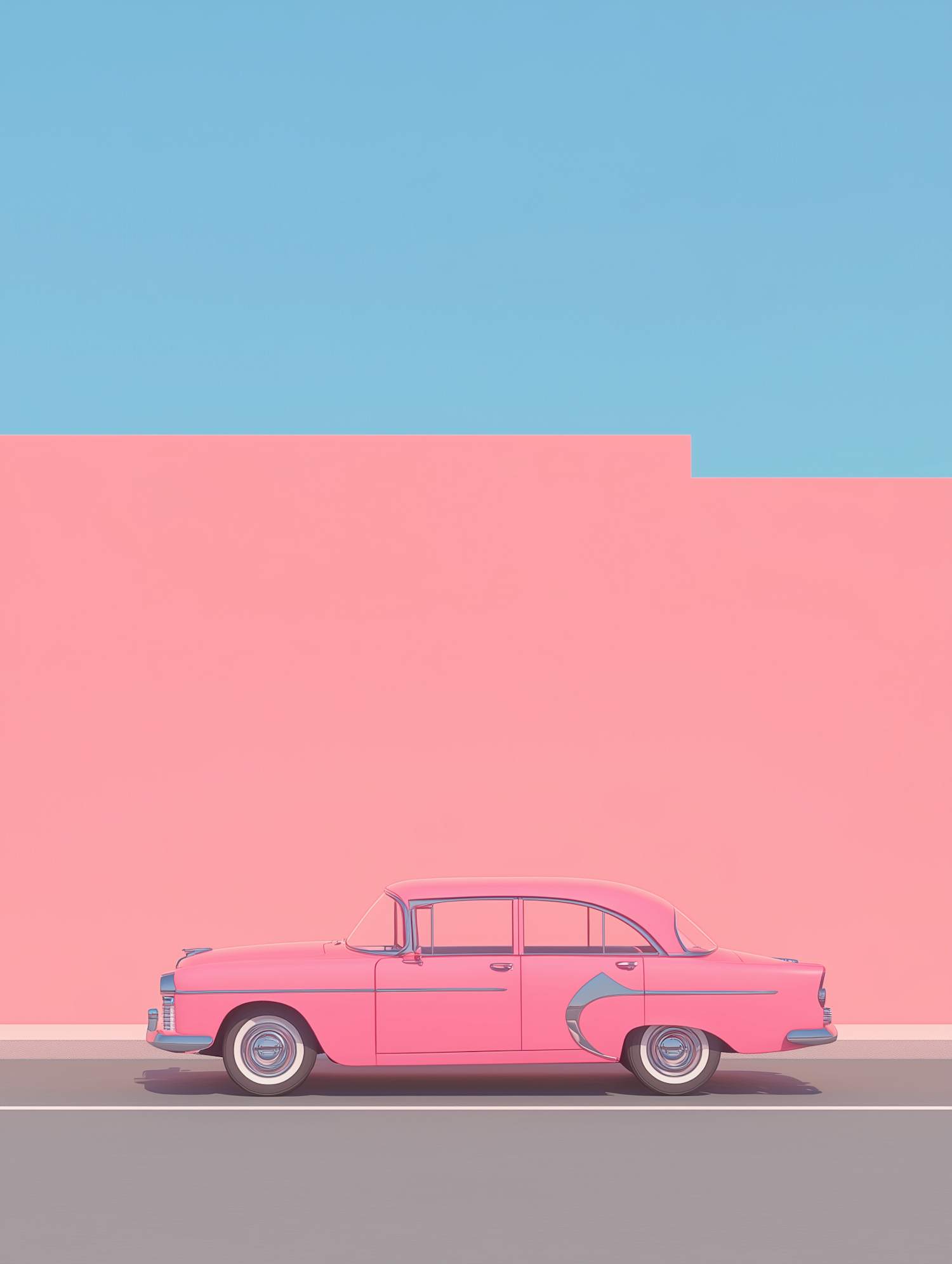 Vintage pink car against a pastel pink wall with a clear blue sky, creating a minimalist and retro aesthetic.