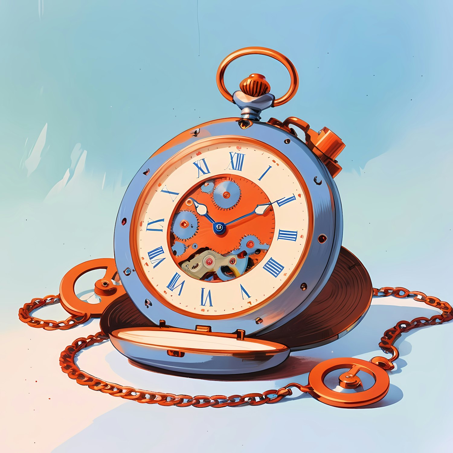A detailed illustration of a vintage pocket watch with exposed orange and blue gears, Roman numerals, and a sleek metallic chain.