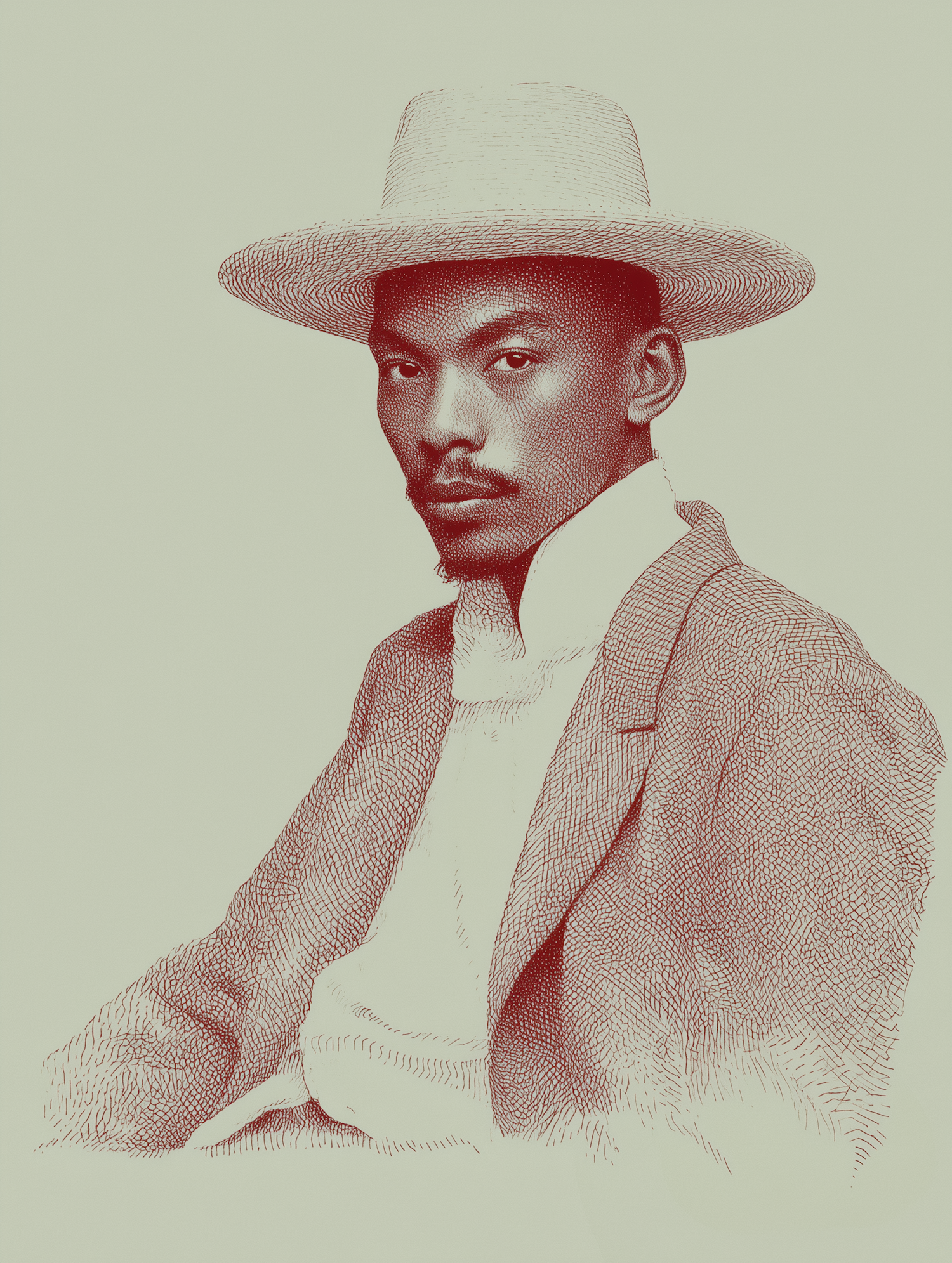 A monochromatic illustration of a man in a wide-brimmed hat and suit, showcasing intricate linework and a vintage aesthetic.