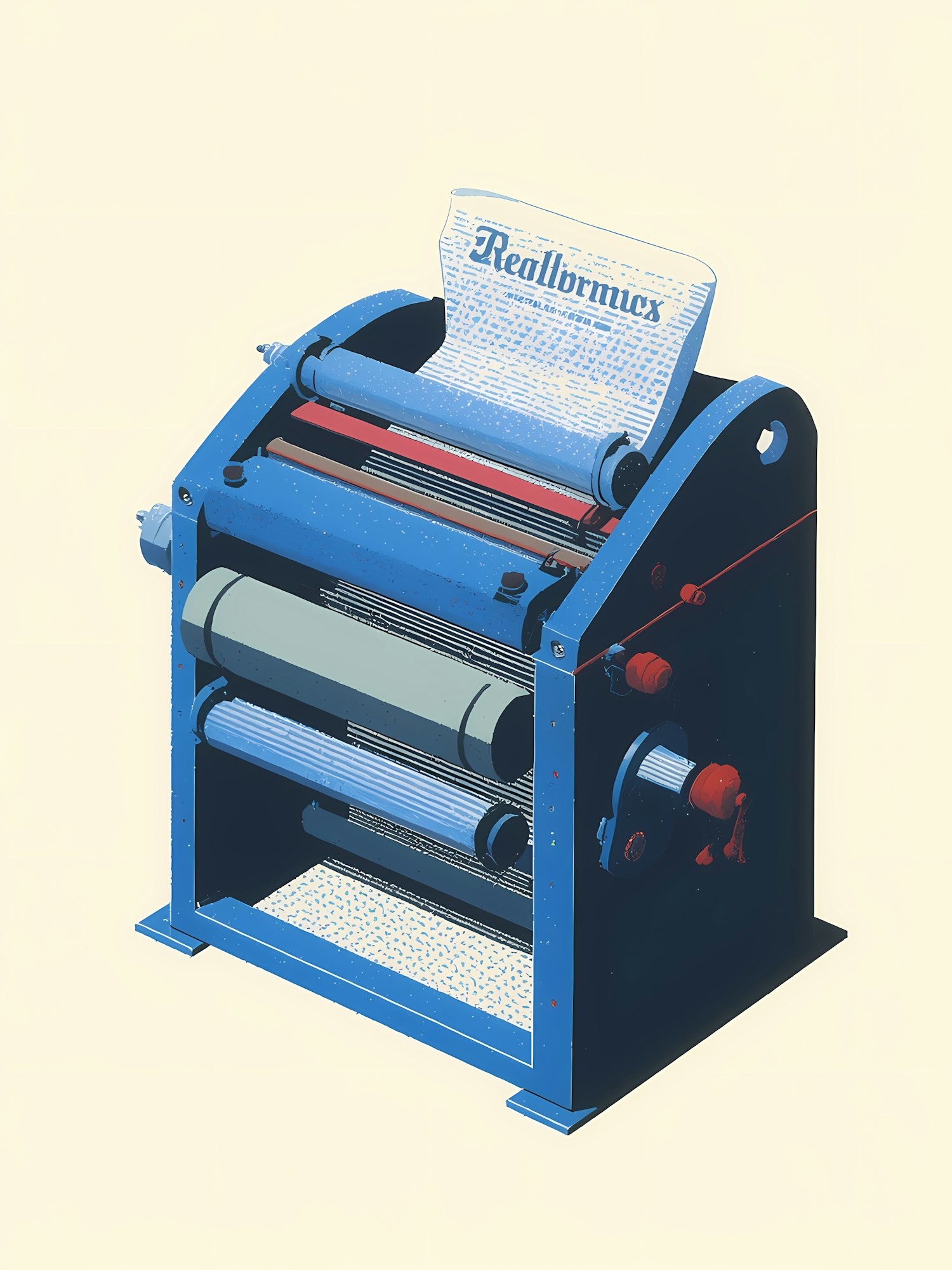 Stylized illustration of a vintage printing press with a bold design, featuring blue and red accents and a paper reading 'Realbrunx'.