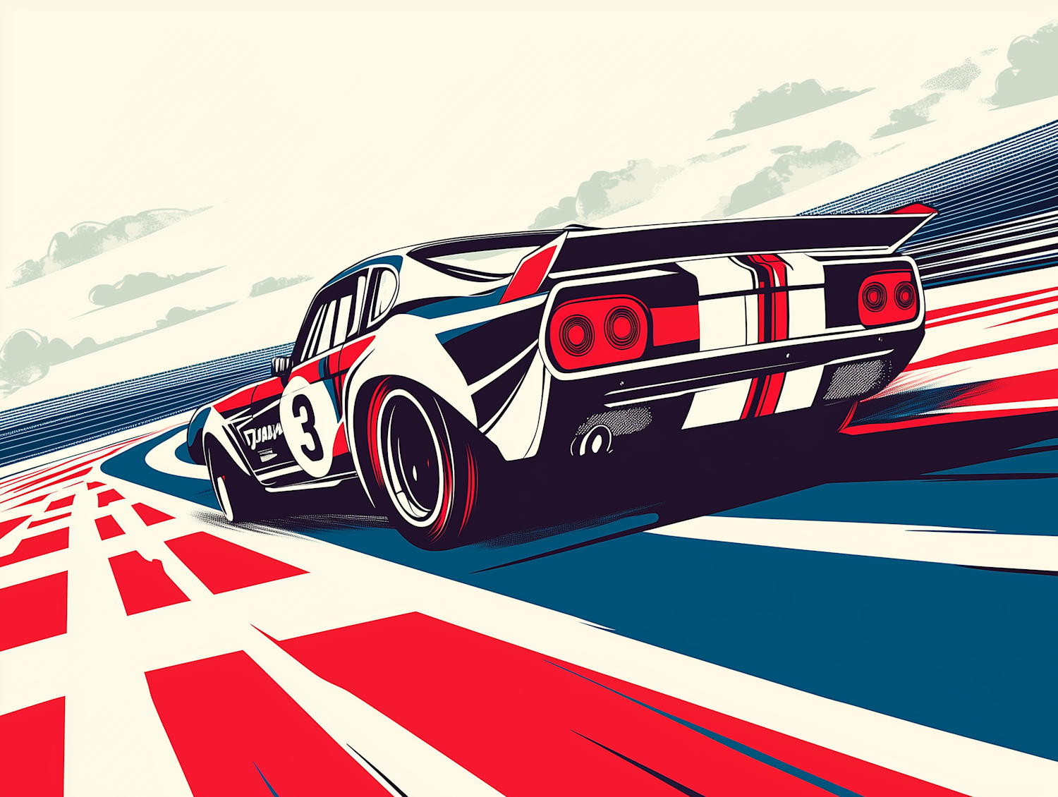 Stylized illustration of a vintage race car with bold red, white, and blue stripes speeding on a dynamic track.