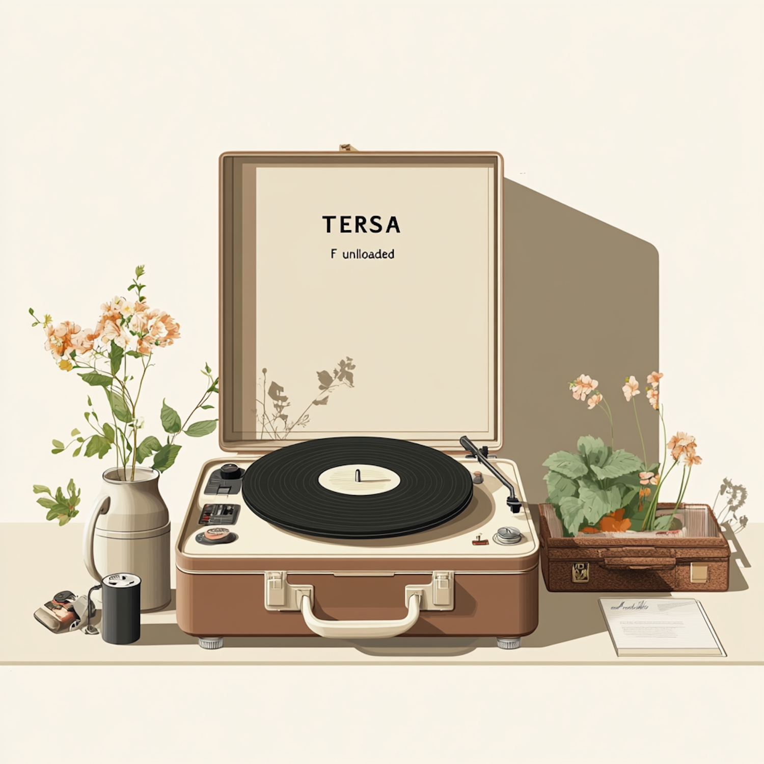 Vintage turntable with flowers and a suitcase, creating a nostalgic and warm atmosphere with soft, muted colors.