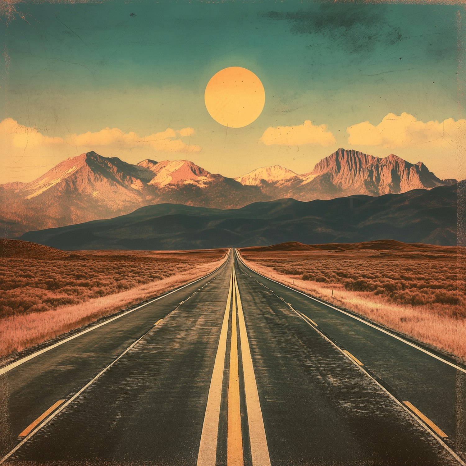 A surreal vintage-style road leading to mountains under a glowing sun, with warm tones and a nostalgic, textured aesthetic.